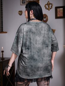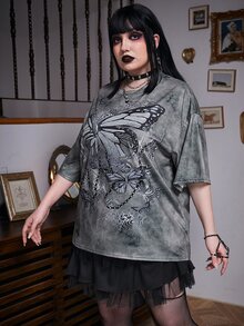 Goth Camiseta de hombros caídos de tie dye con estampado de mariposa