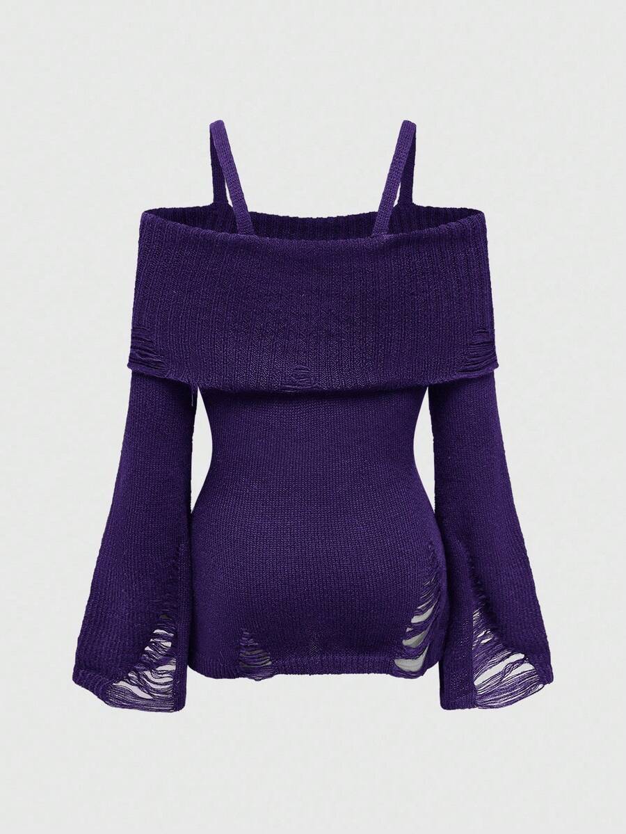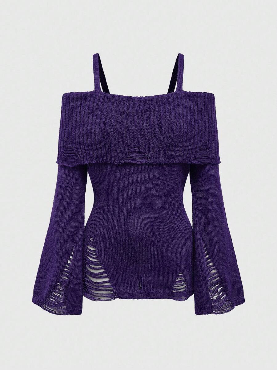 Goth Suéter de punto ajustado con hombros descubiertos y efecto desgastado de estilo punk