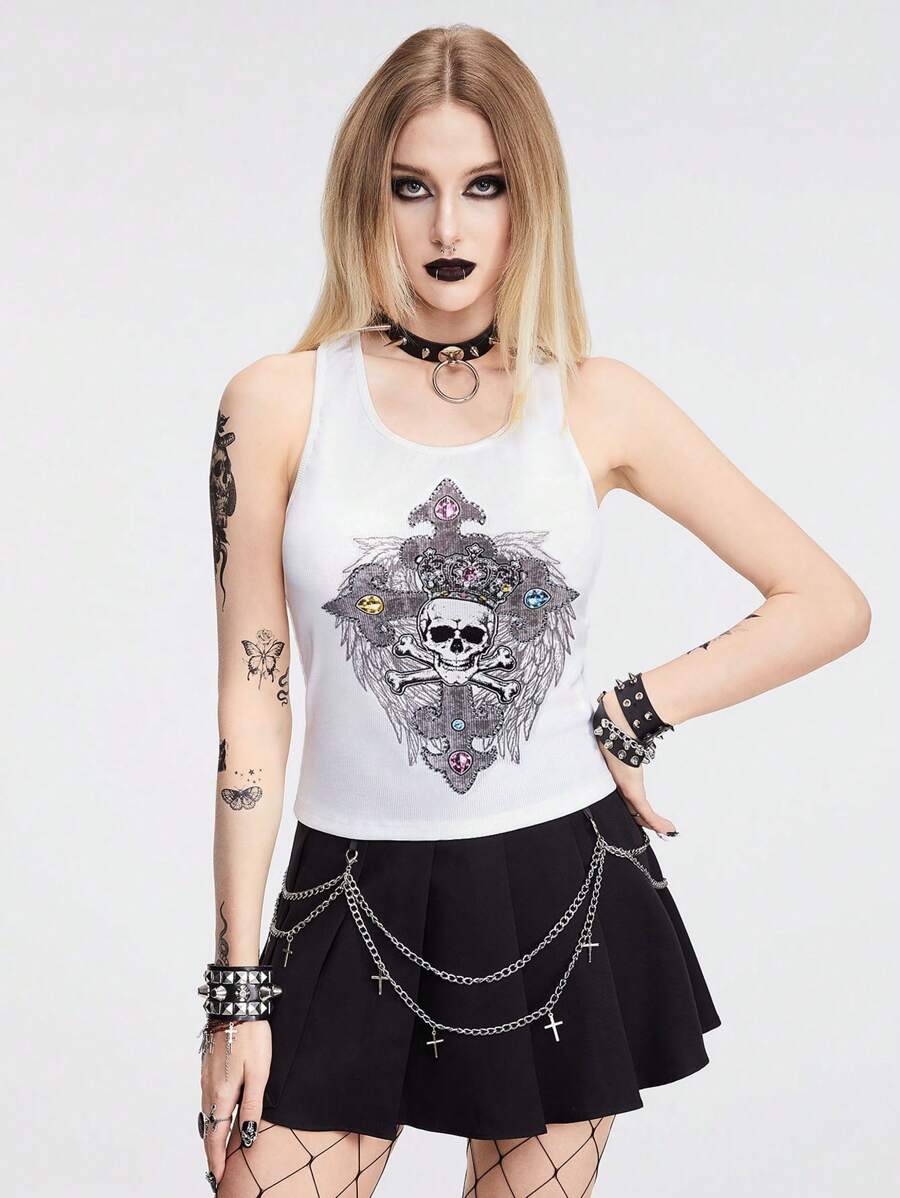 Goth Top de tanque ajustado con estampado de letras de patrón cruzado alado de corona y calavera, embellecido con pedrería y ajuste de cintura
