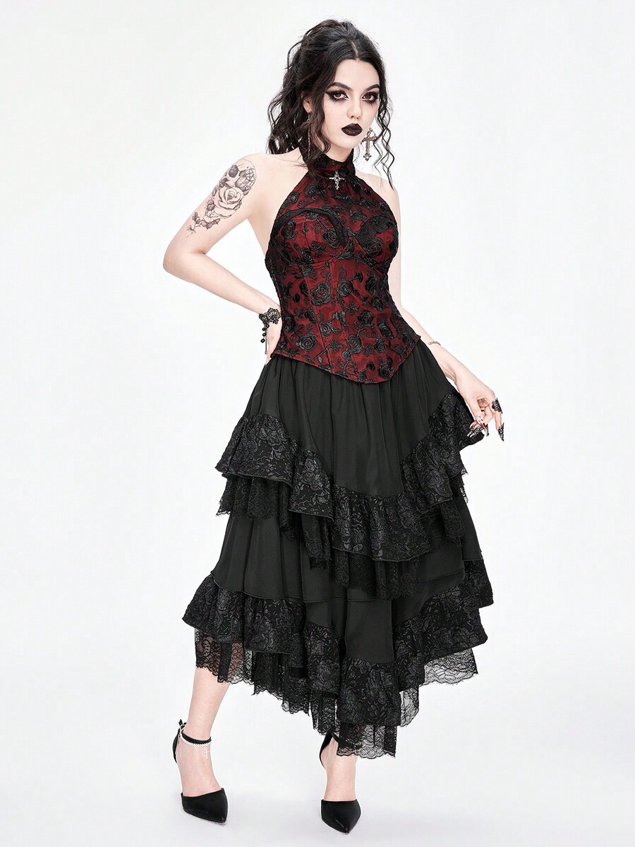 Goth Top de tirantes asimétrico para mujer con cuello cruzado de encaje sexy y colgante, con dobladillo asimétrico