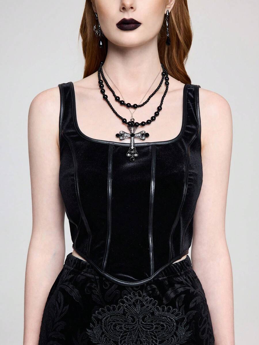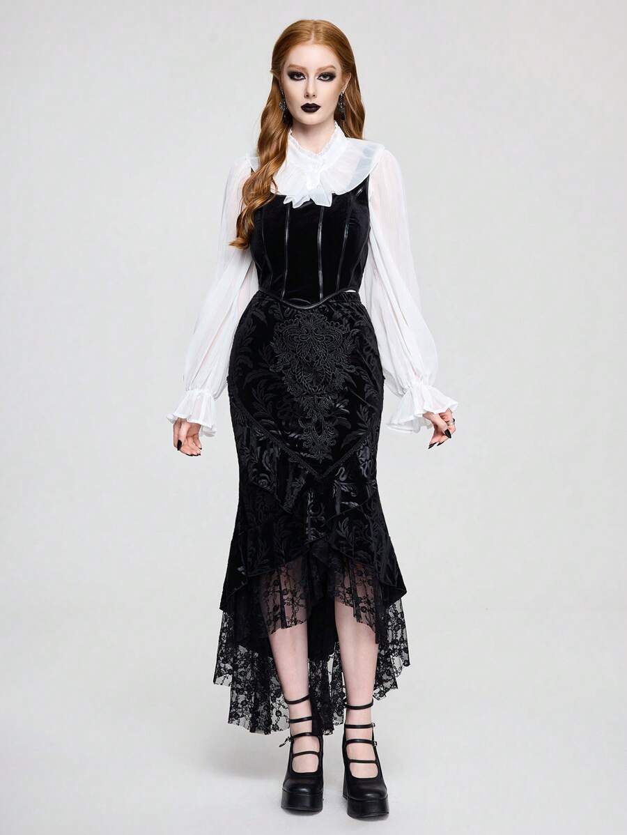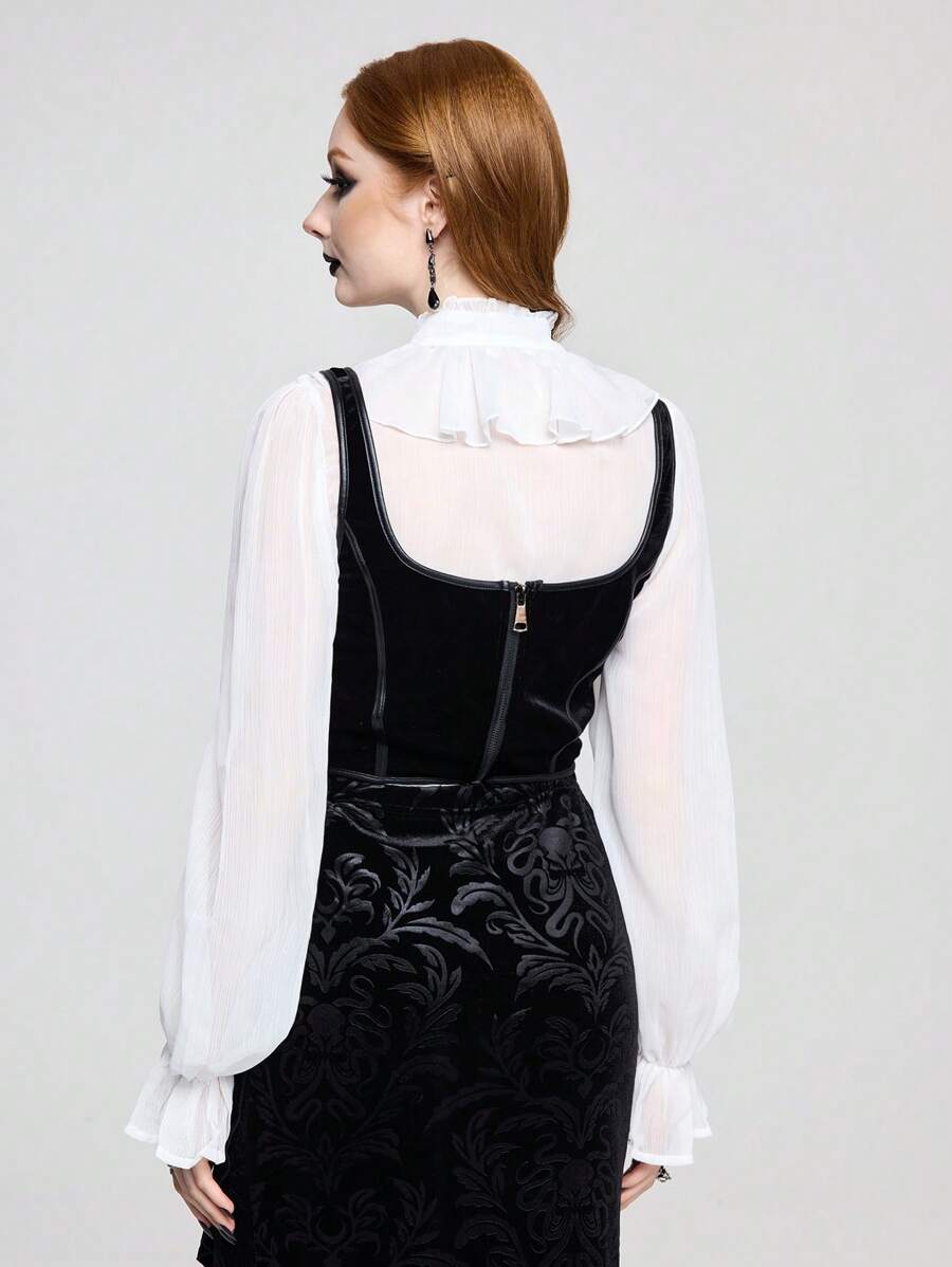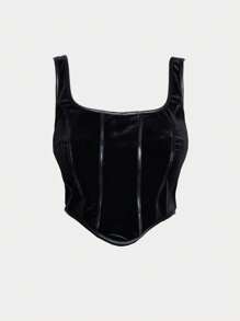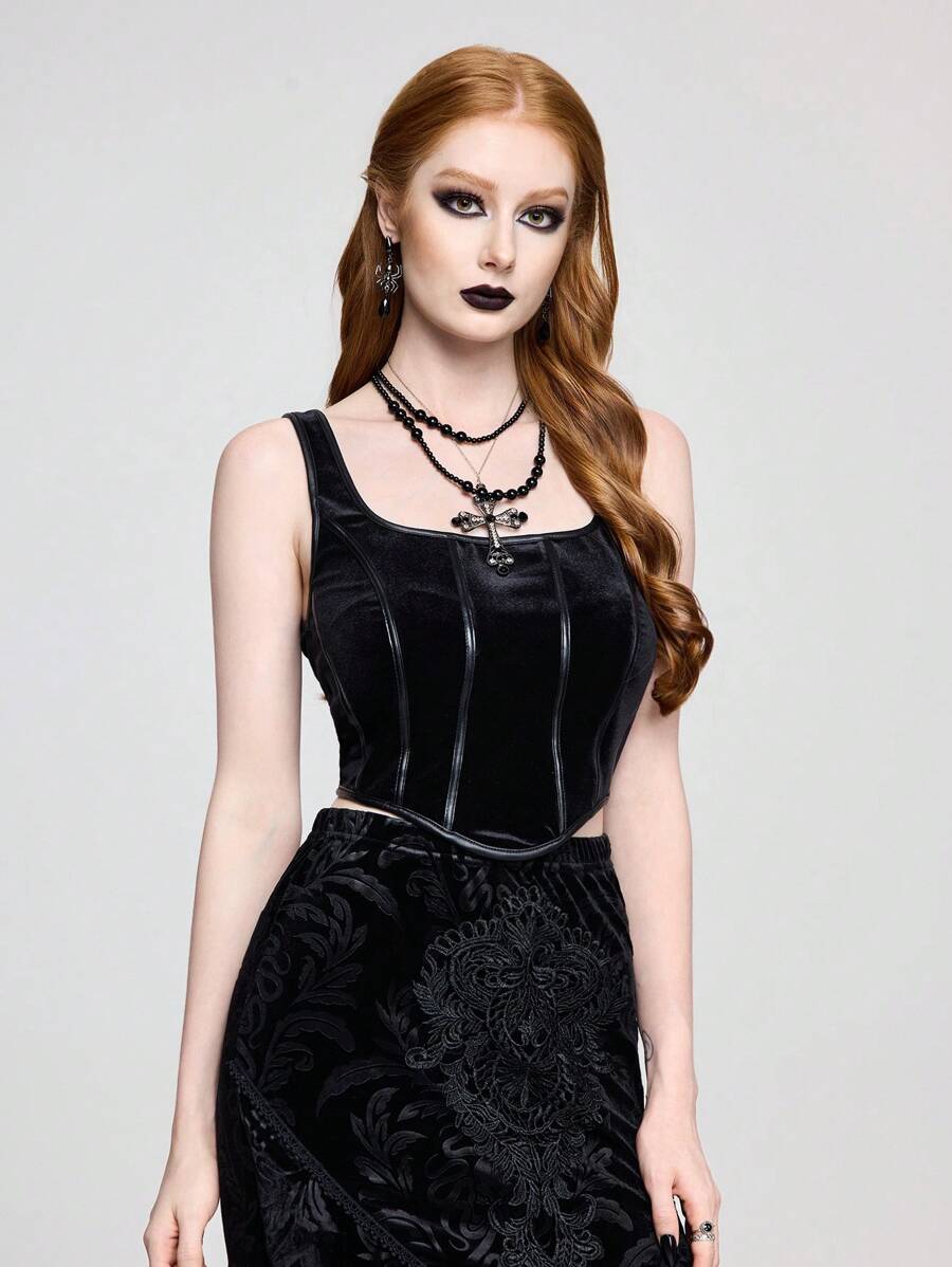 Goth Camiseta sin tirantes de unicolor con cremallera, cuello cuadrado y bajo asimétrico de patchwork de terciopelo sexy para mujeres
