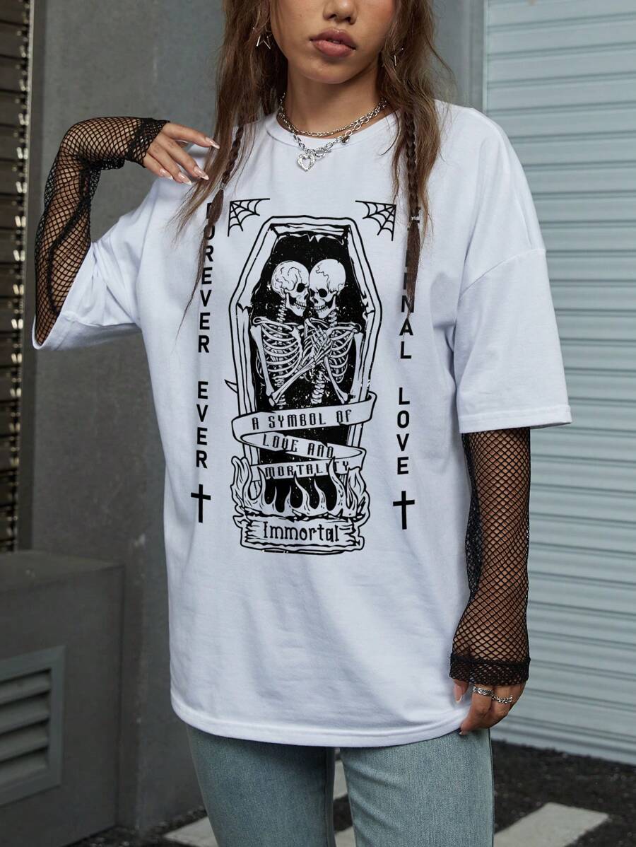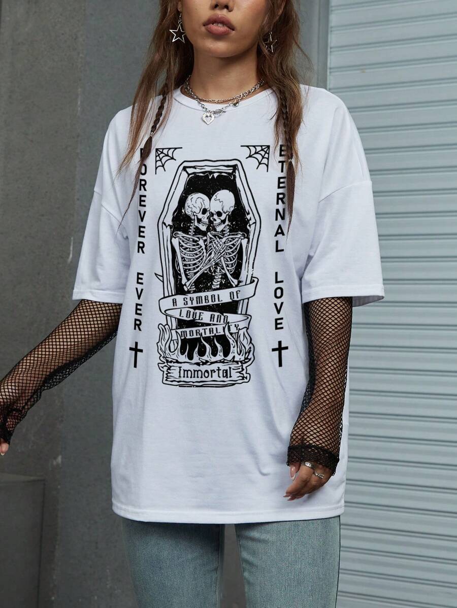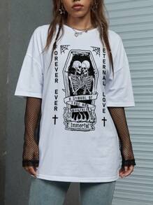 Goth Camiseta de hombros caídos con estampado de cráneo y letra