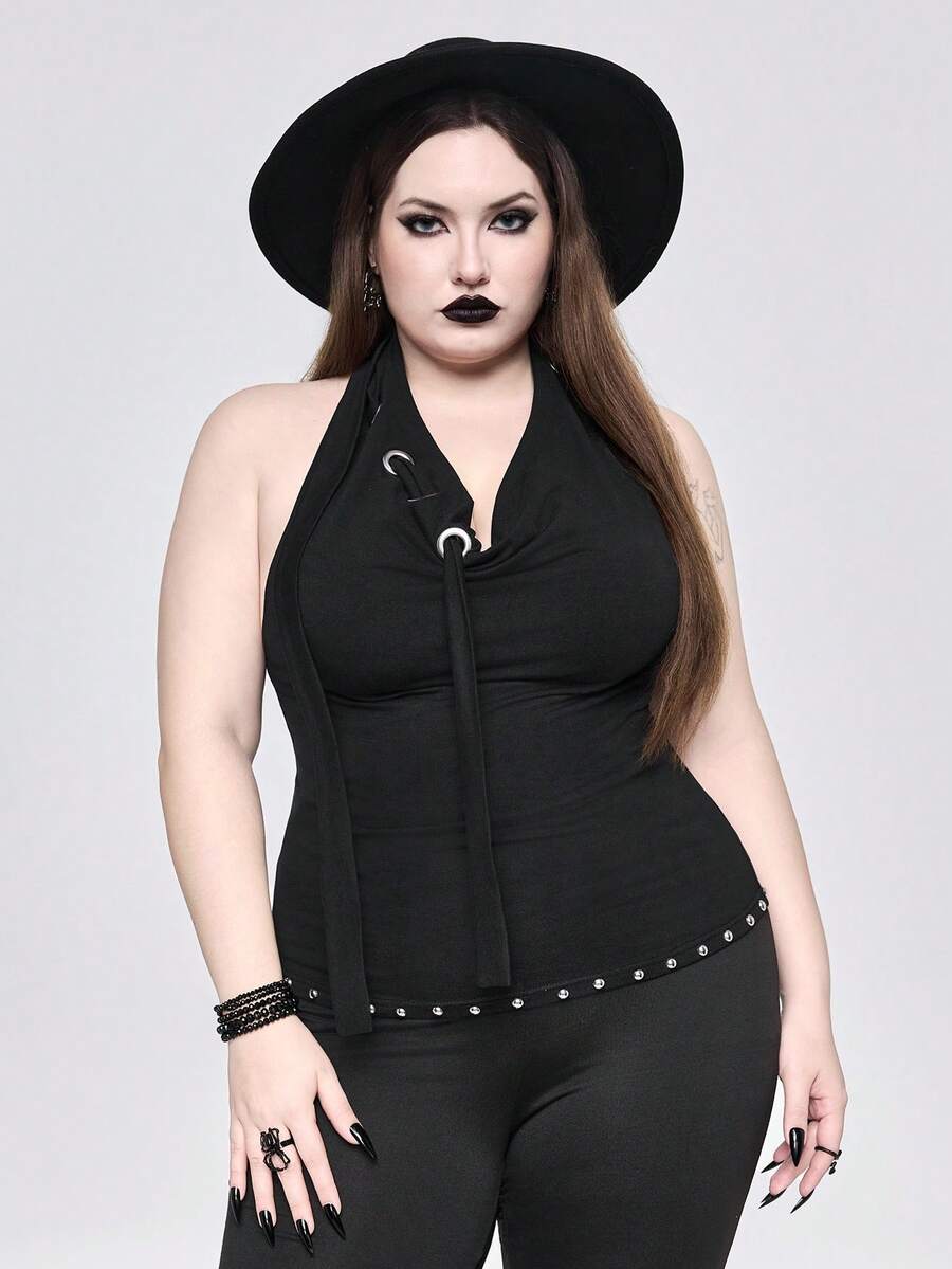 Goth Camiseta y top sin mangas con cuello rasgado, decoración de anillos metálicos y ojetes, estilo grunge-punk, edgy, para fiestas y festivales de música, talla grande. Tops de estilo punk, de fiesta, de festival de música, de calle, para mujer, talla grande, para otoño/invierno.