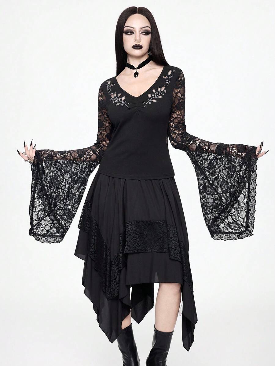 Goth Top ajustado con mangas acampanadas y encaje floral estilo bohemio gótico oscuro de Bosque Prohibido