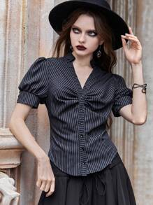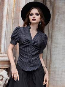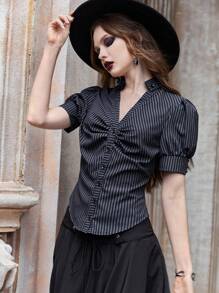 Goth Camisa con estampado de rayas de manga farol fruncido