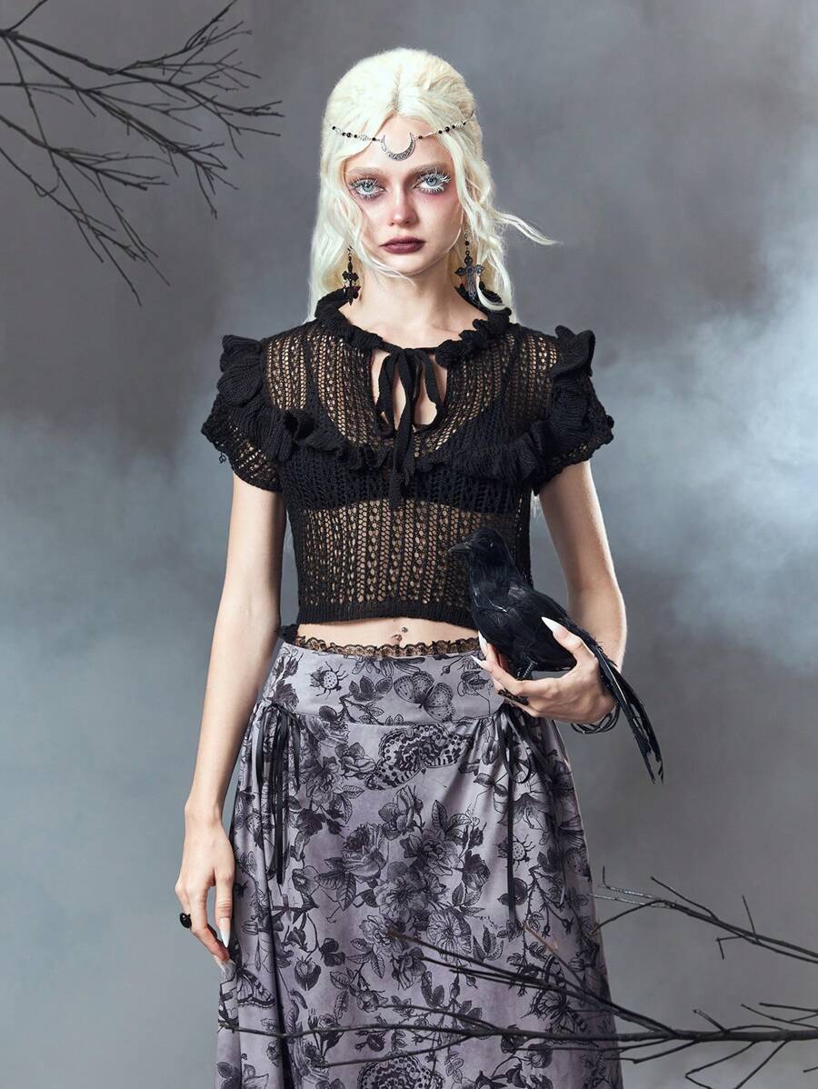 Goth Top de punto con abertura con encaje ribete con con cordón delantero