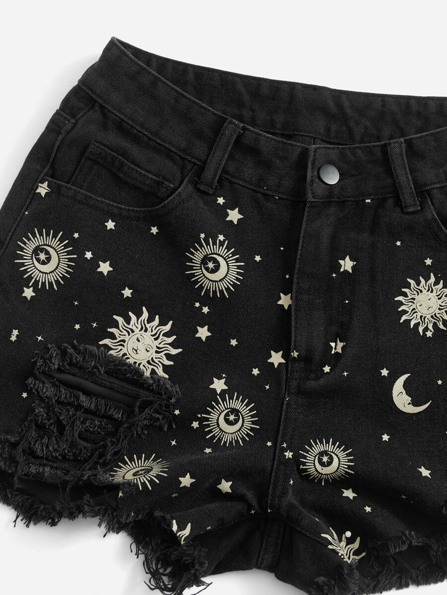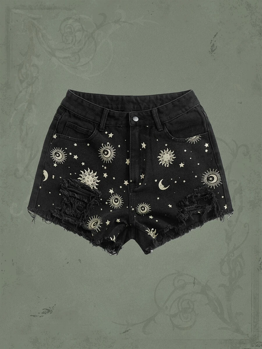Goth Shorts en mezclilla con estampado de sol y luna roto