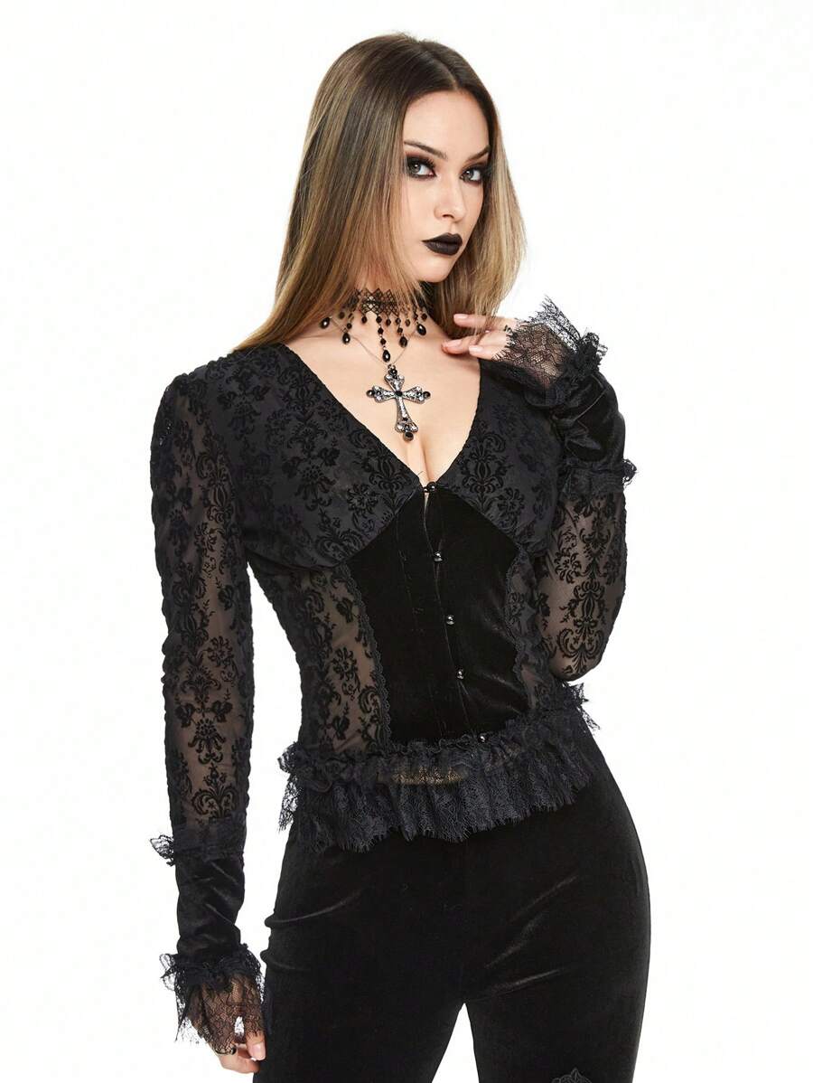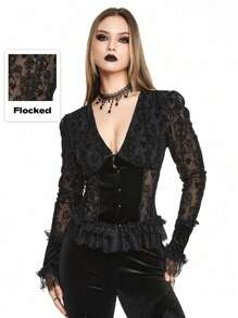 Goth Blusa de manga campana con recorte de encaje de estilo floral vintage, romántico y gótico, con estampado floreado tipo tapicería