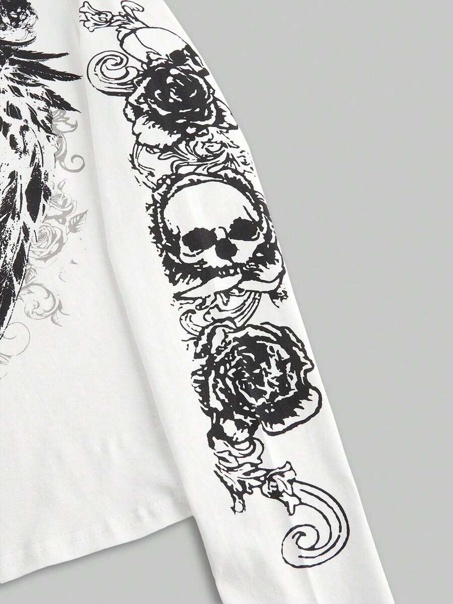 Goth Camiseta de mujer con cuello redondo, alas cruzadas y calavera simétrica desgastada