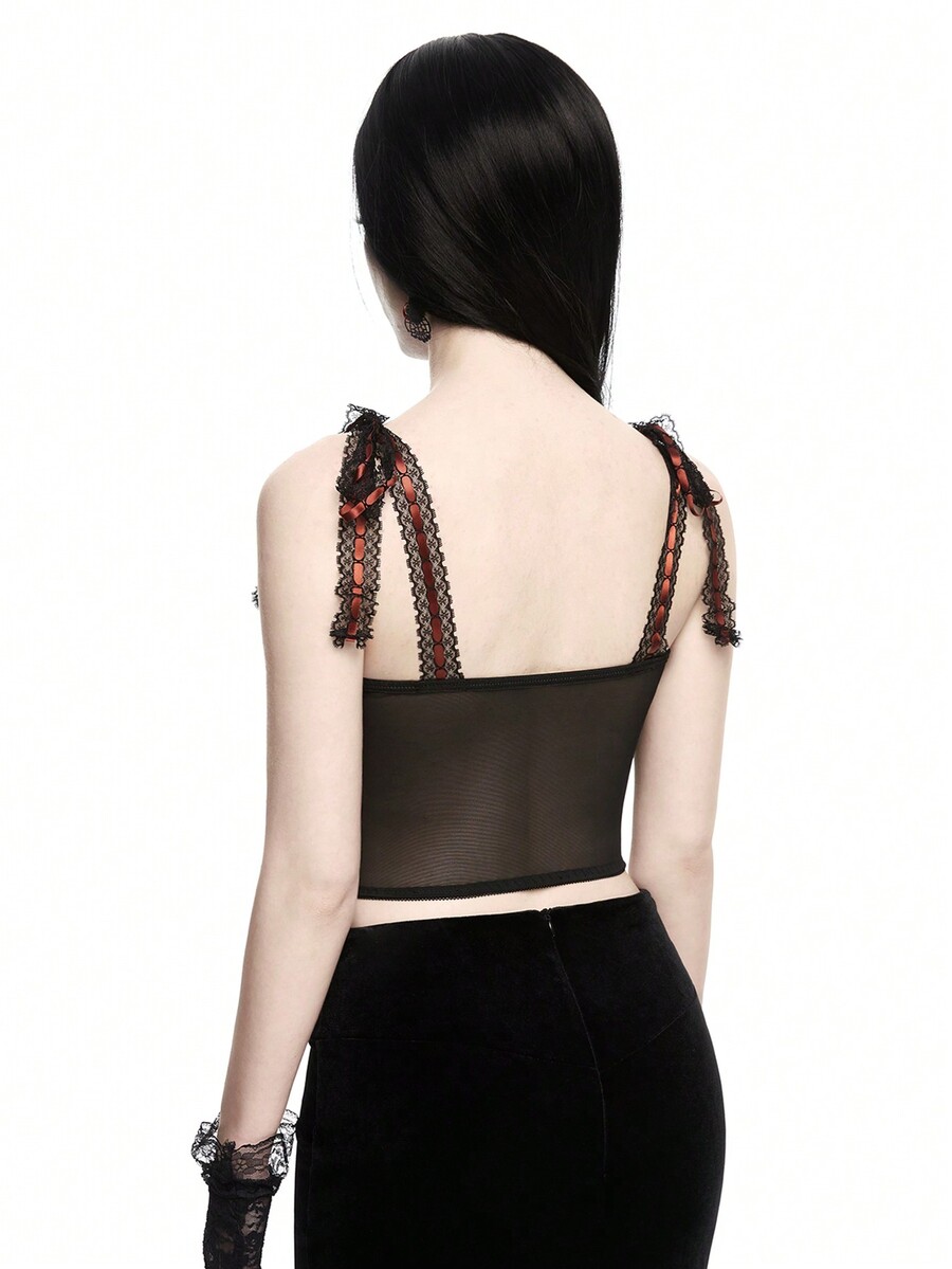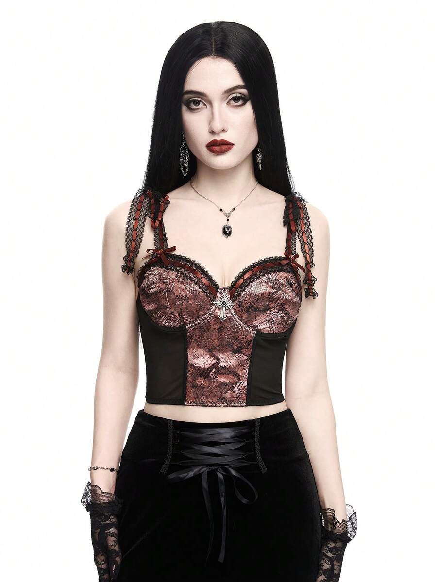 Goth Top de tirantes de malla con estampado de serpiente para mujer con colgante cruzado, diseño de lazo y encaje