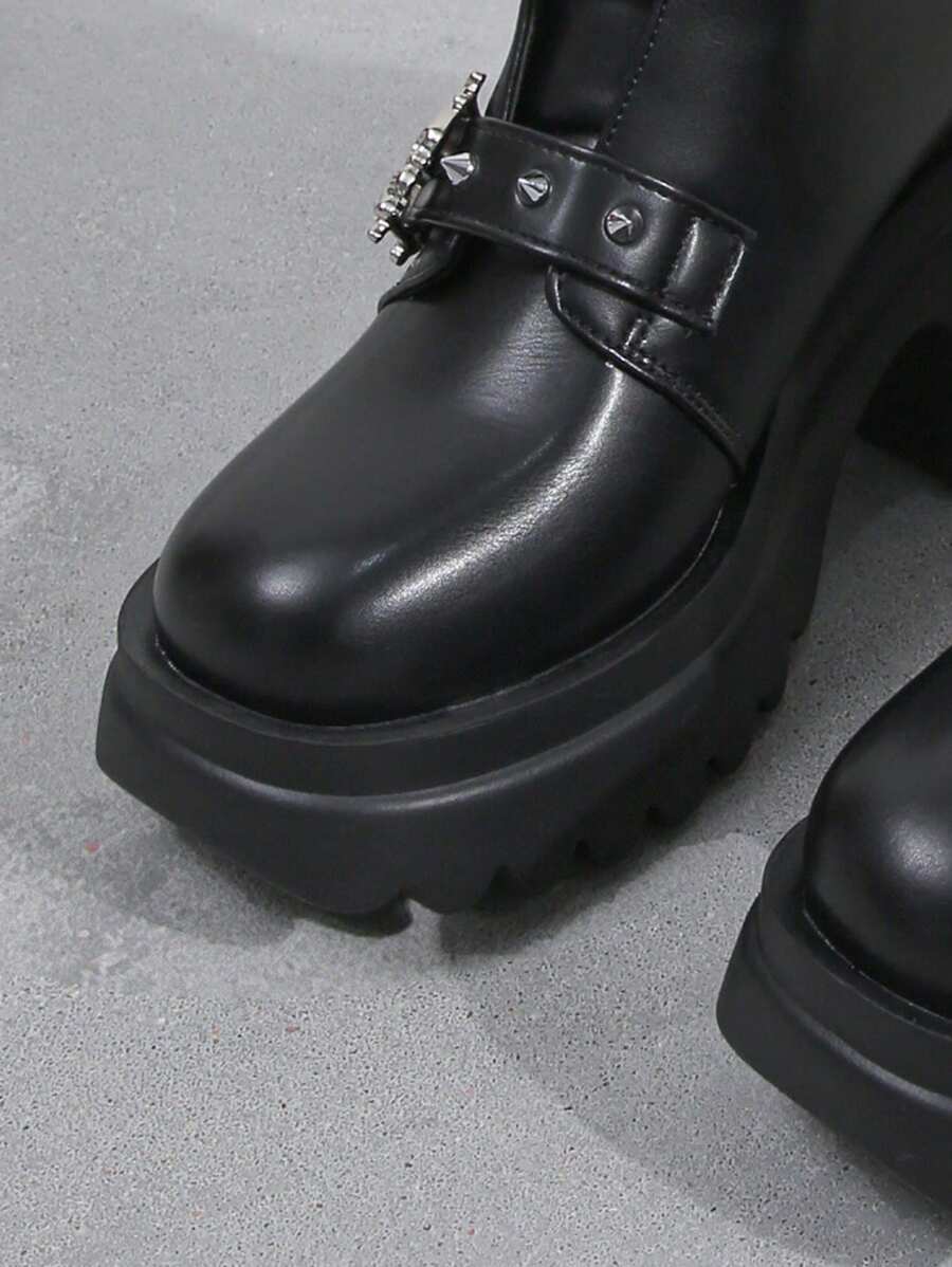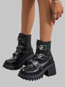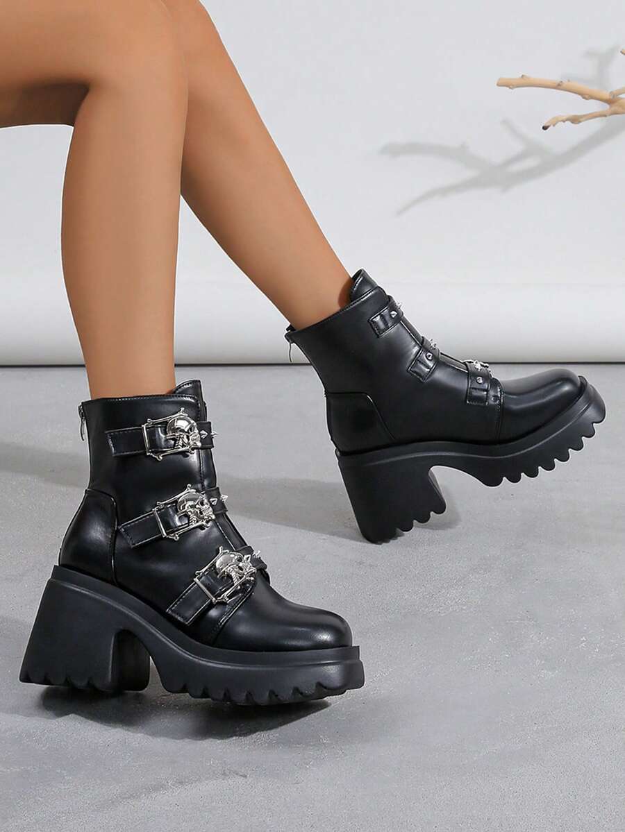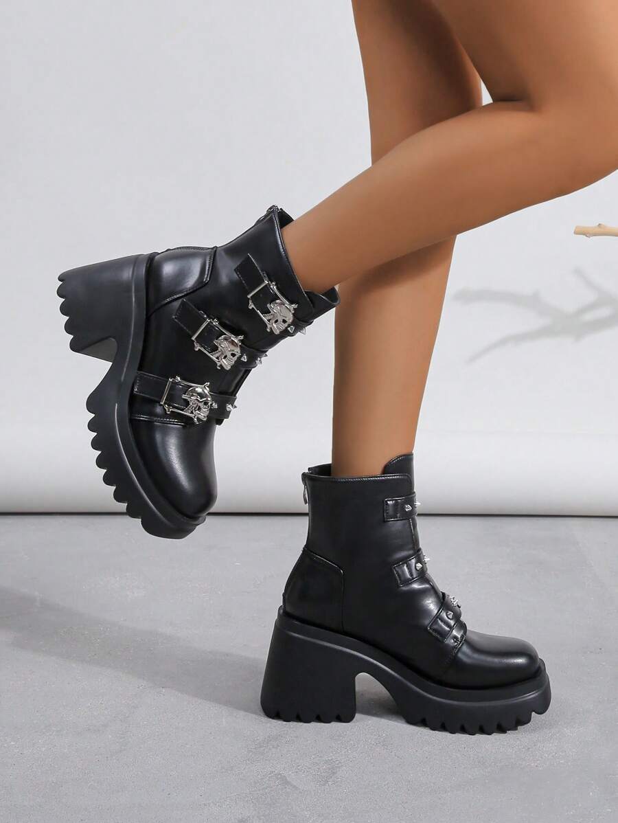 Goth Botas de tobillo de plataforma con cuña, tacón de gótico oscuro de primavera y otoño de 2024 para mujer, con nuevos remaches y hebilla con cabeza de calavera