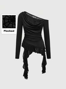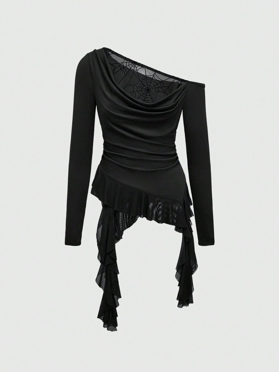 Goth Camiseta de moda de manga larga con cuello asimétrico, drapeado y malla con diseño de telaraña para otoño