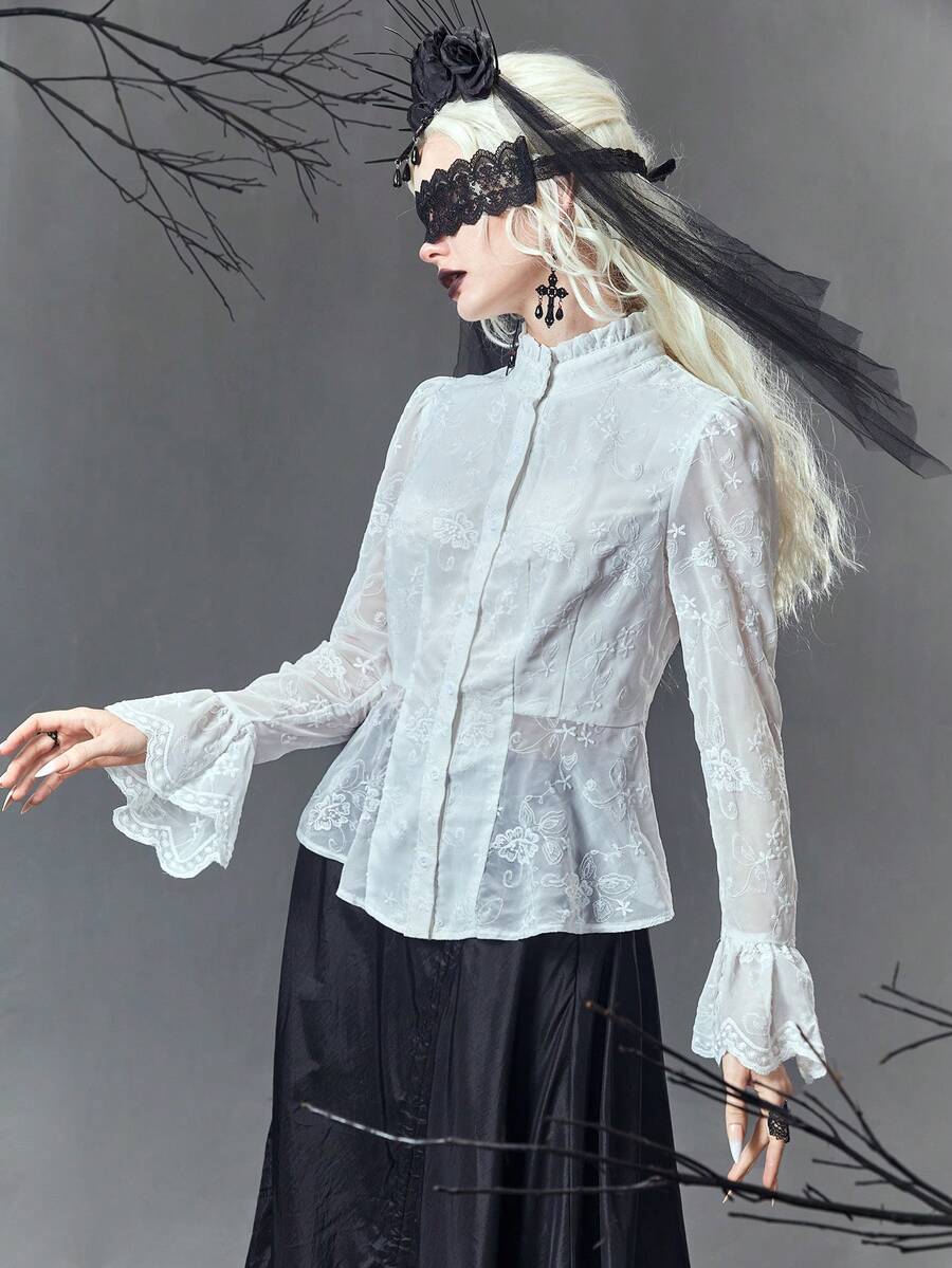 Goth Camisa De Mujer Con Bordado Floral Y Cuello Con Volantes
