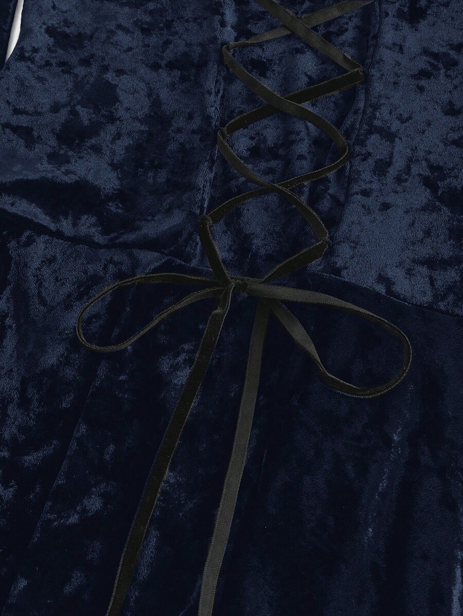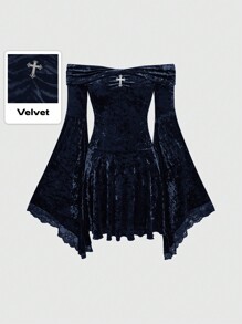 Goth Vestido retro de mujer con hombros descubiertos, plisado frontal, colgante cruzado, mangas acampanadas, encaje de contraste y terciopelo