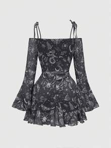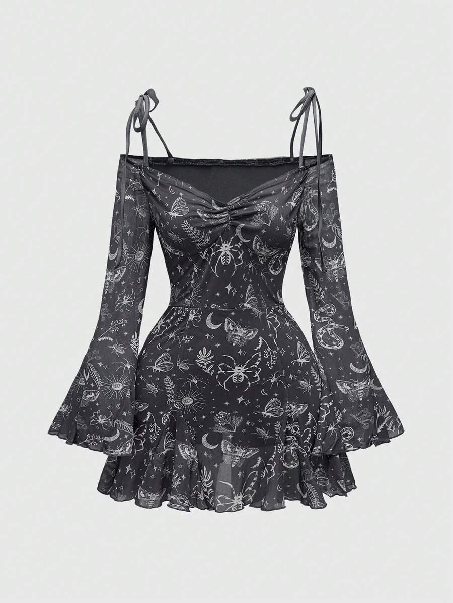 Goth Vestido Cami Sexy para Mujer con Estampado de Mariposa, Araña, Insecto y Flores, Con Hombros Descubiertos