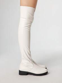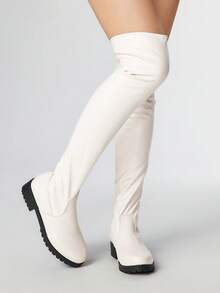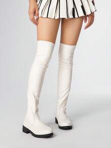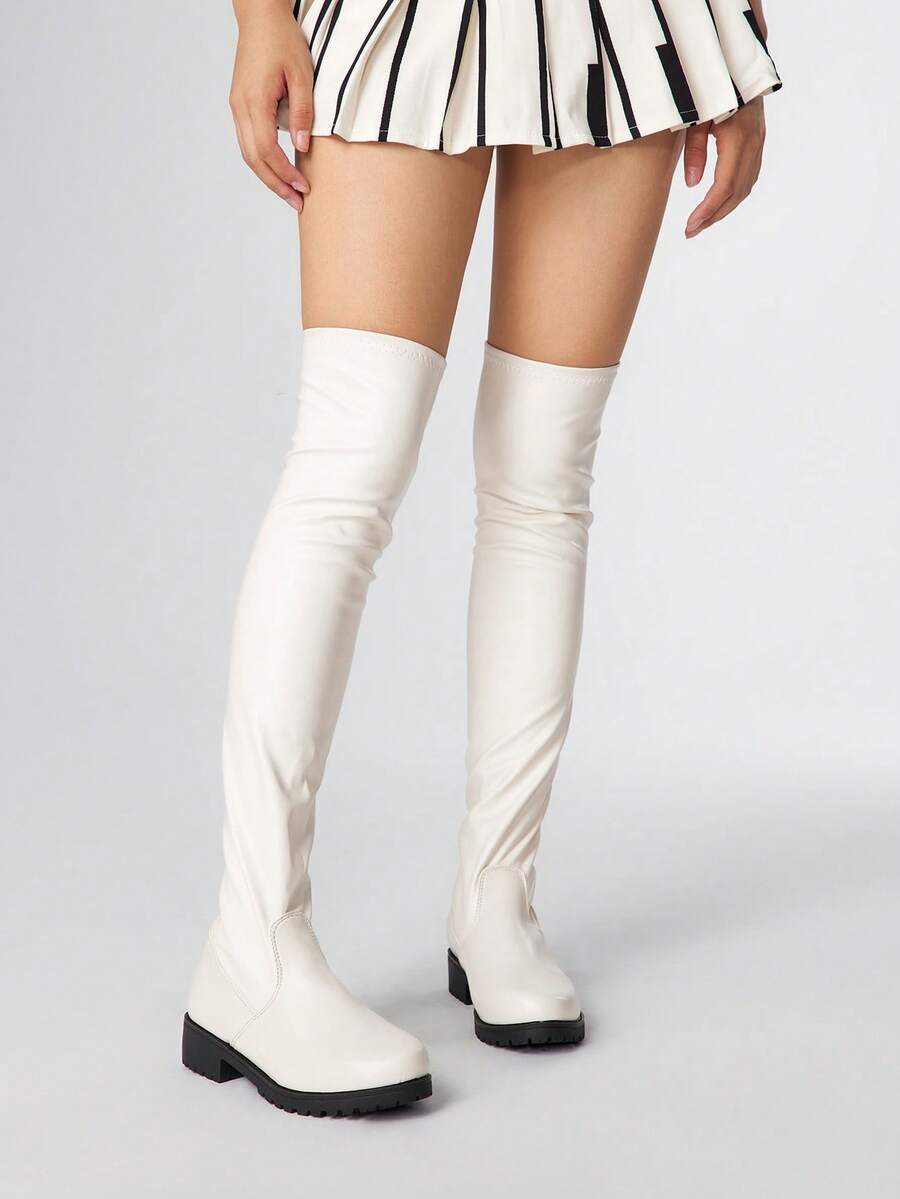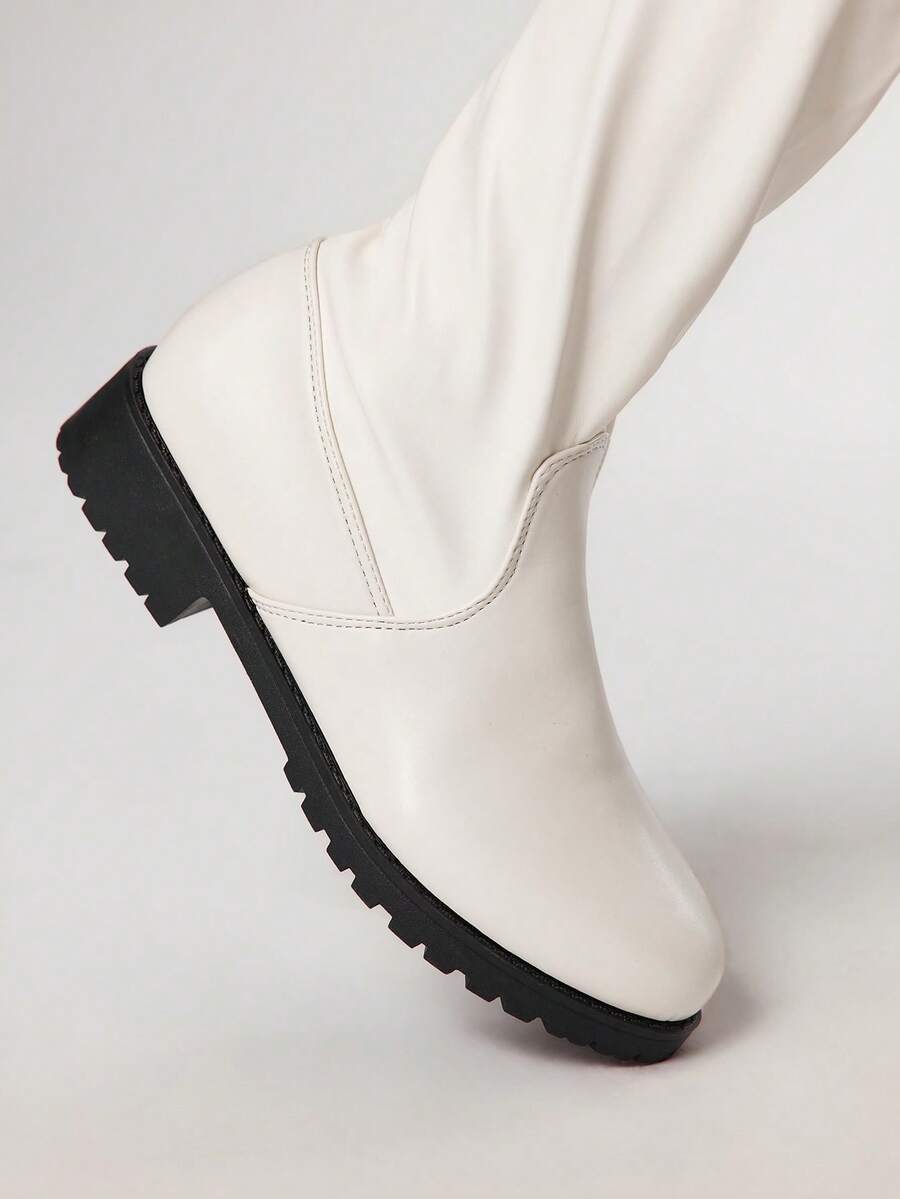 Goth Botas elásticas plisadas de tacón bajo y punta cuadrada para mujer, con parte superior de cuero, botas altas de moda para exteriores con diseño deslizante, nuevas llegadas para otoño/invierno