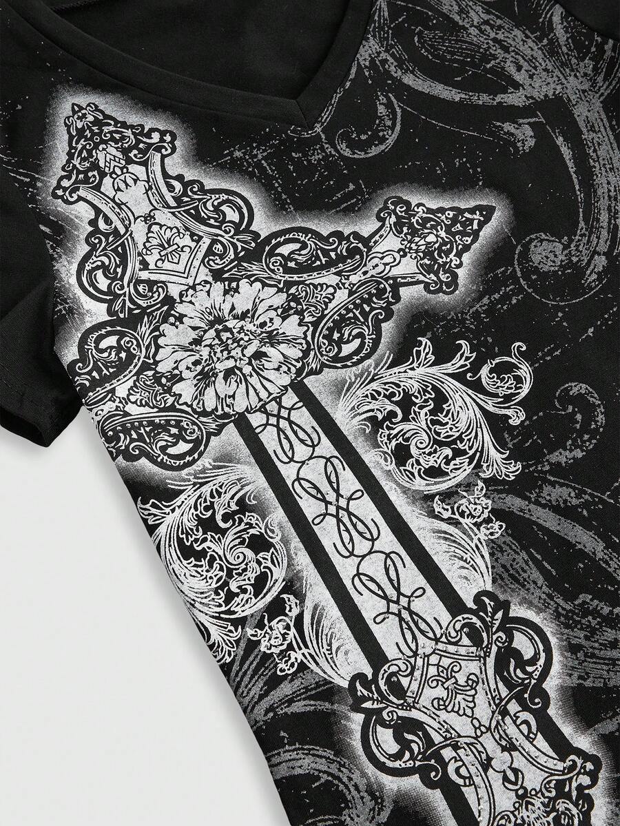 Goth Camiseta con estampado de cruz y vid de manga corta y cuello en V Y2K subcultura para mujer
