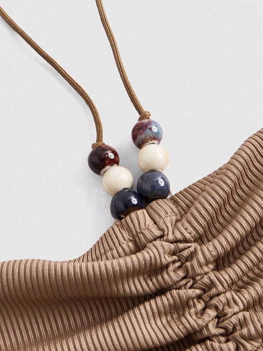 Goth Top Vintage Sin Hombros De Color Caqui Para Mujeres, Con Cuentas Y Halter