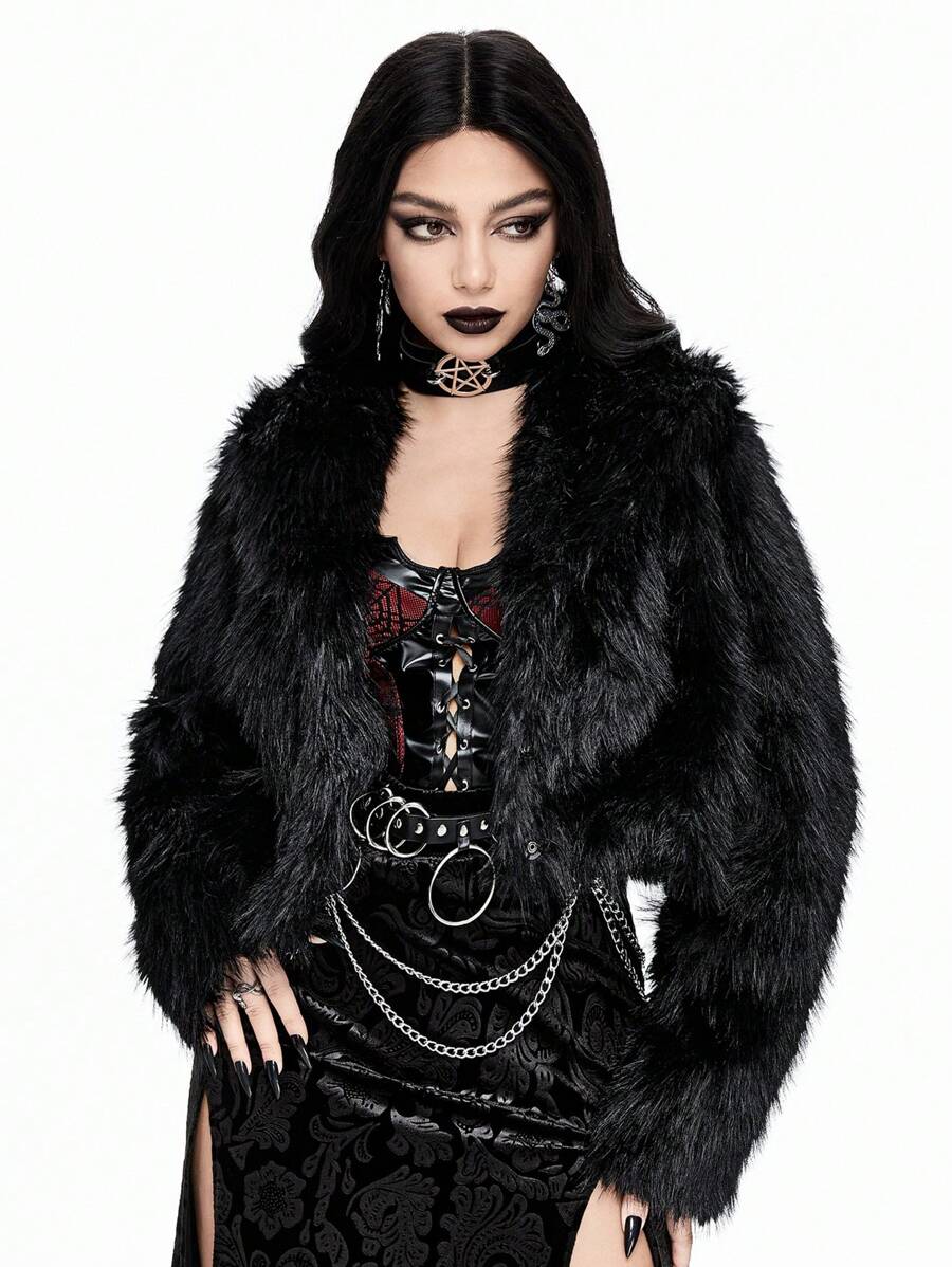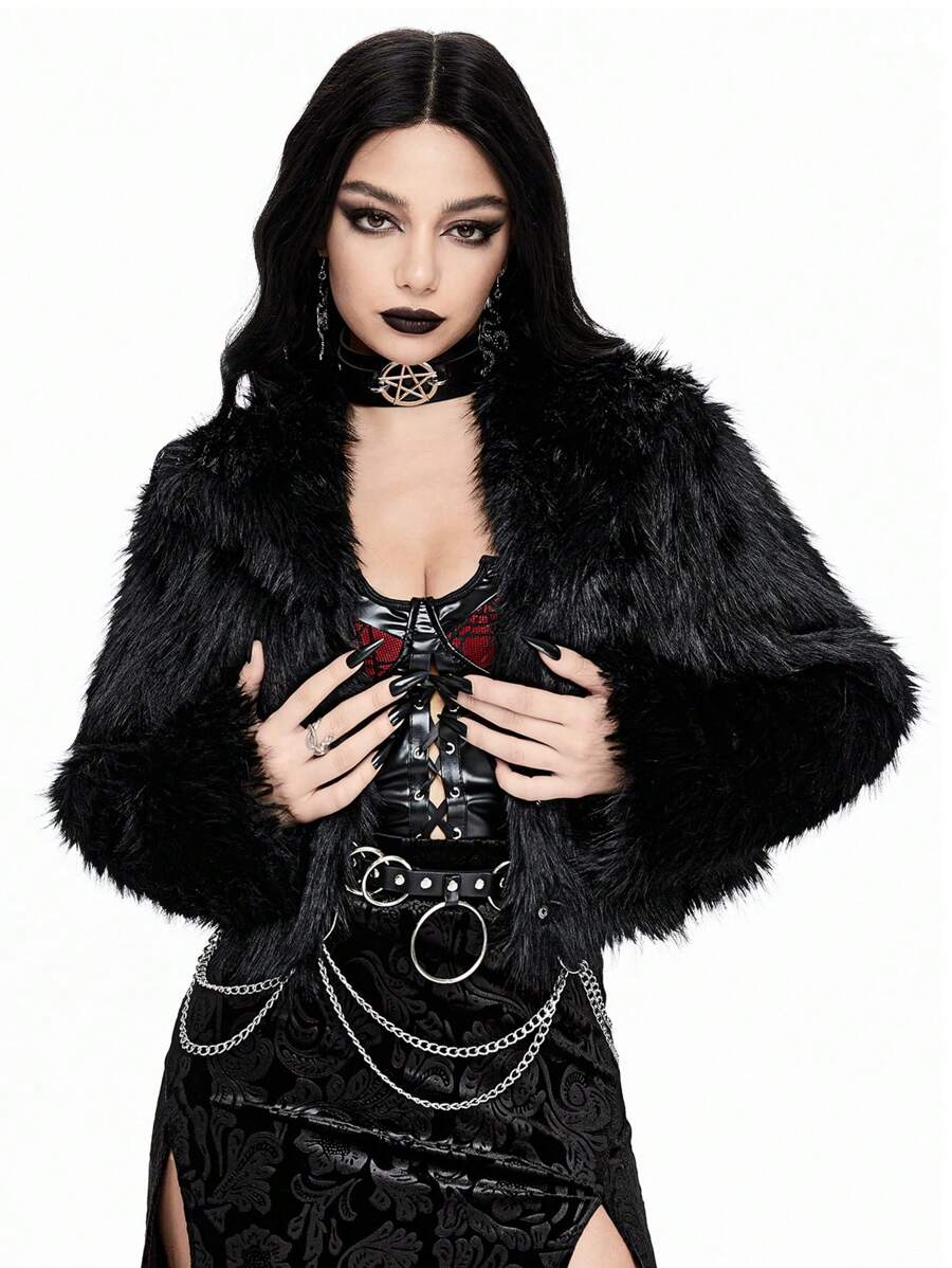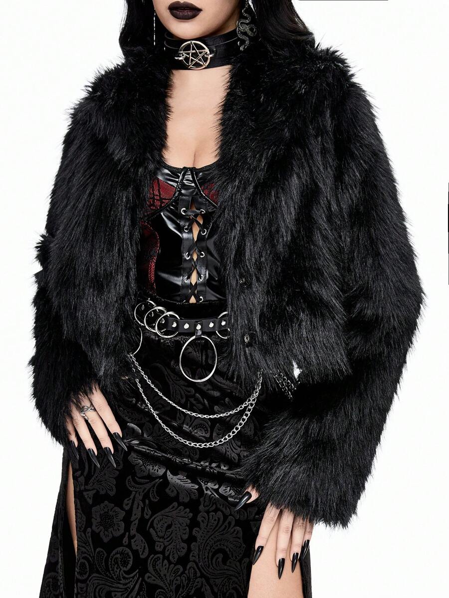 Goth Chaqueta tipo crop de oso de peluche con cuello esponjoso para mujer, ajuste regular, color negro