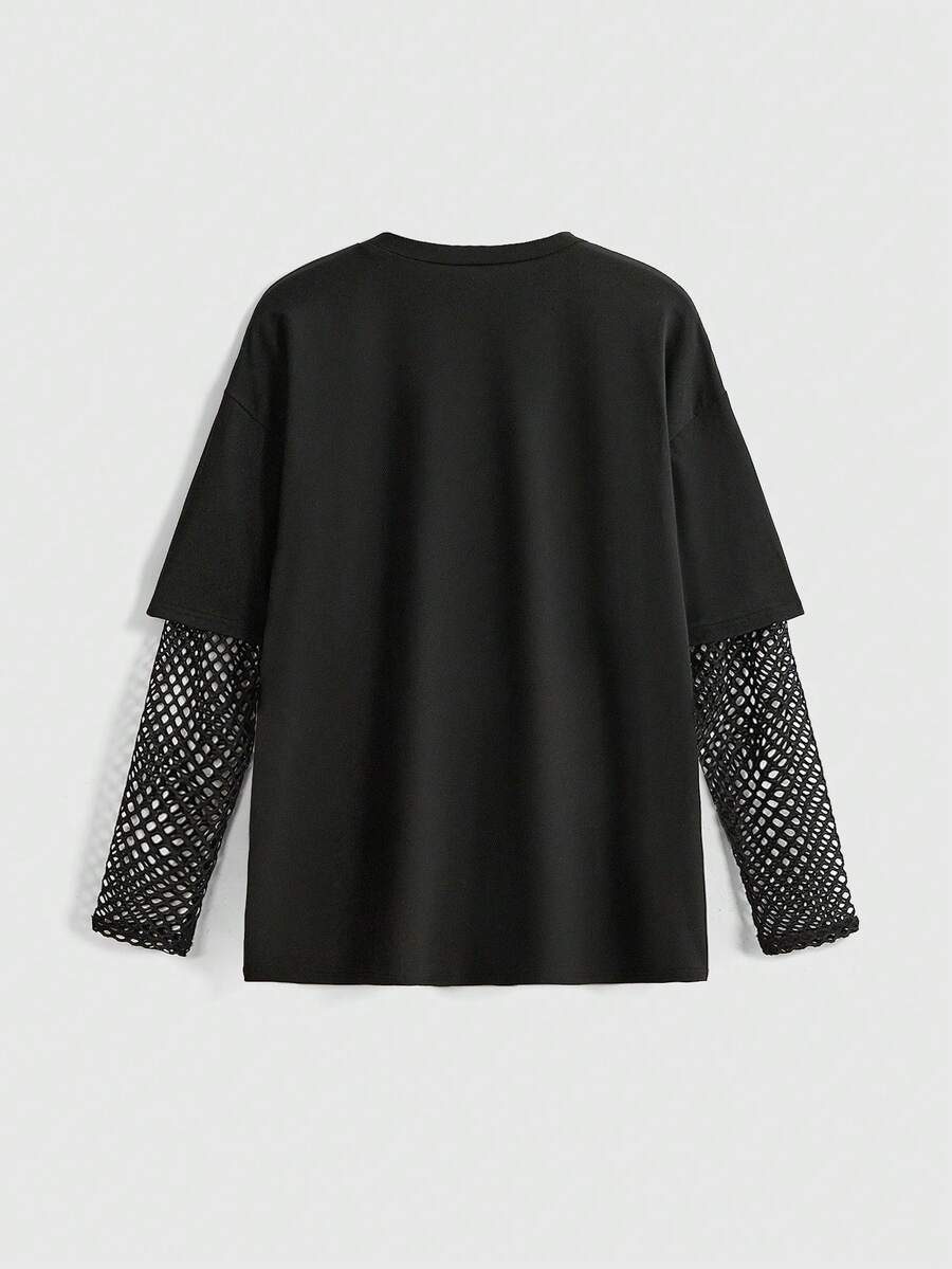 Goth Camiseta holgada con estampado de gato y parches de malla, estilo gótico académico, para la temporada de vuelta al colegio