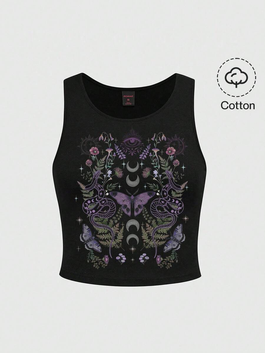 Goth Camiseta sin tirantes de talla grande con estampado gótico estético de mariposa, luna, ojo de serpiente y planta en color negro