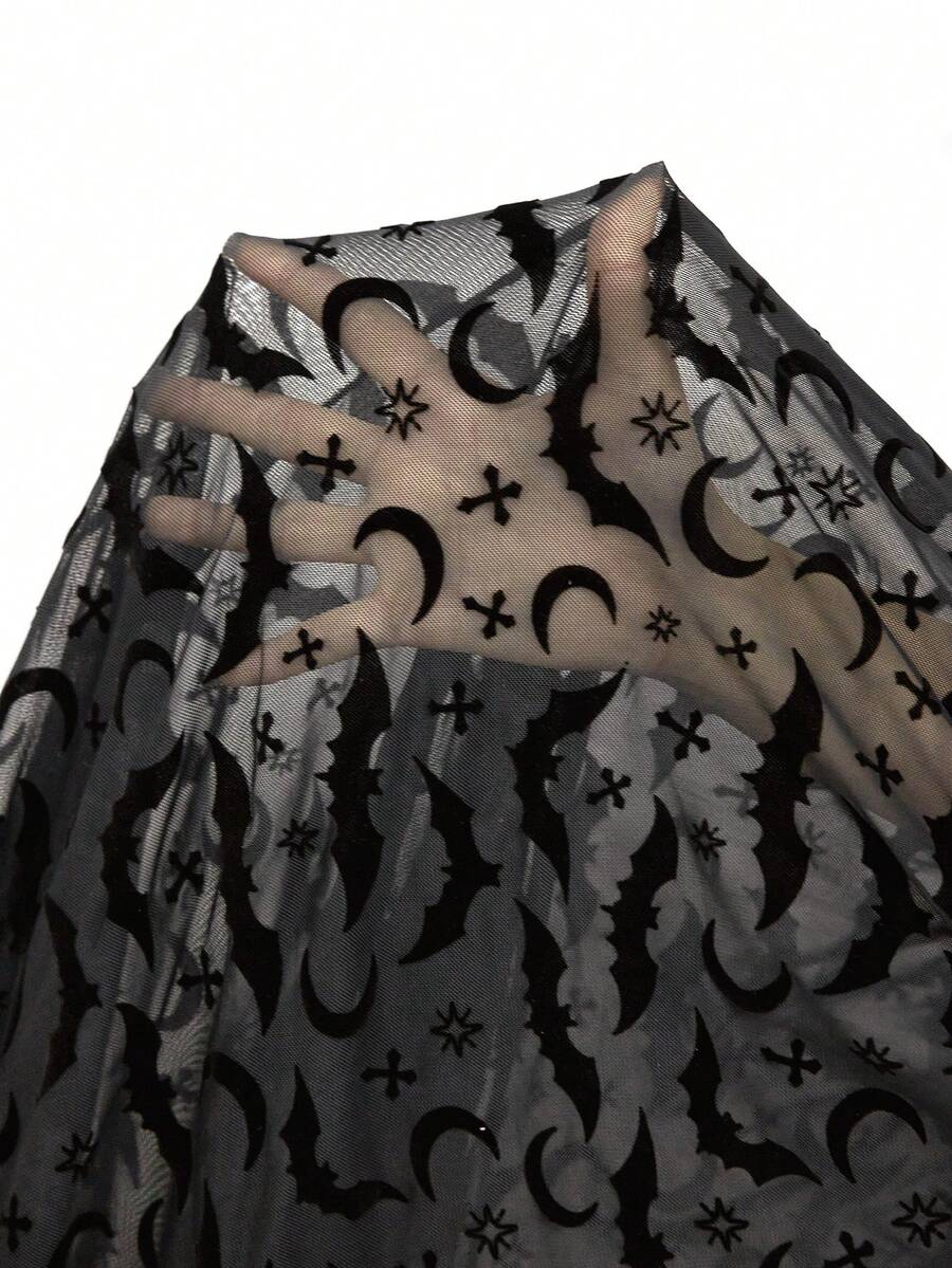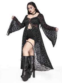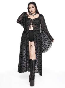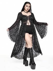 Goth Cárdigan ajustado y extra largo con estampado de murciélago, luna y planta transparente, talla grande