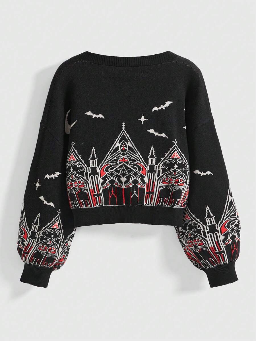Goth Cárdigan de punto jacquard con castillo gótico, iglesia, estrella y luna, suéter corto de talla grande