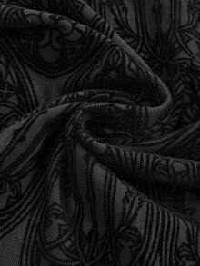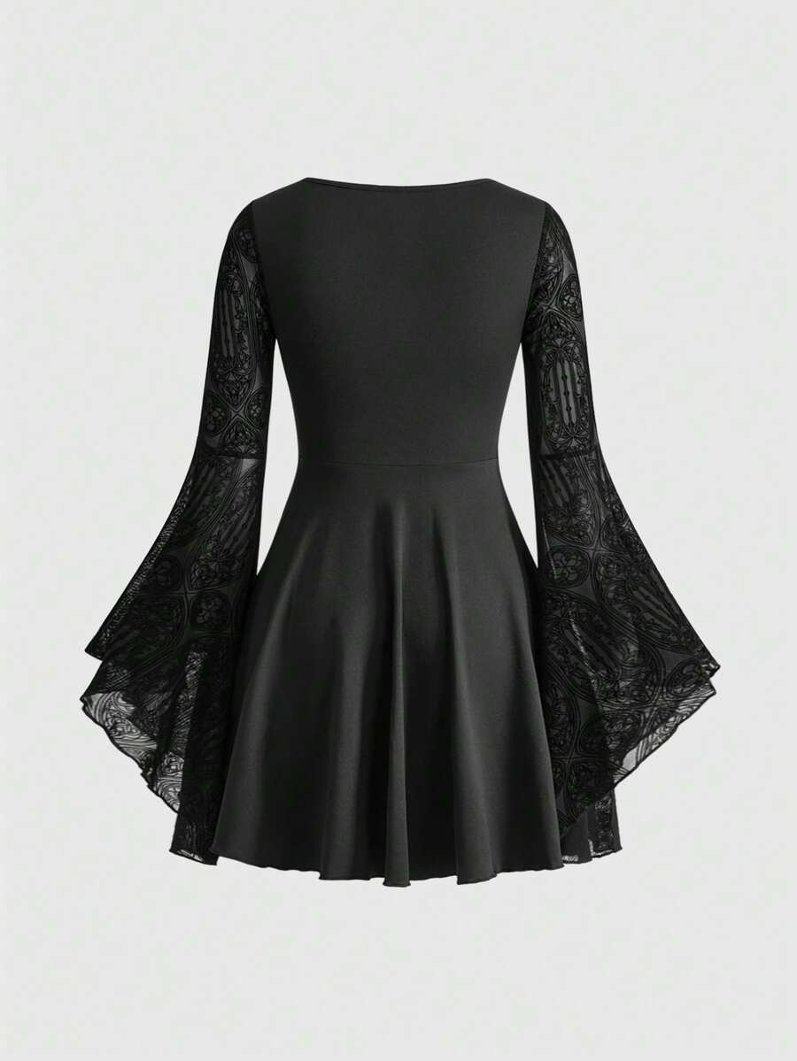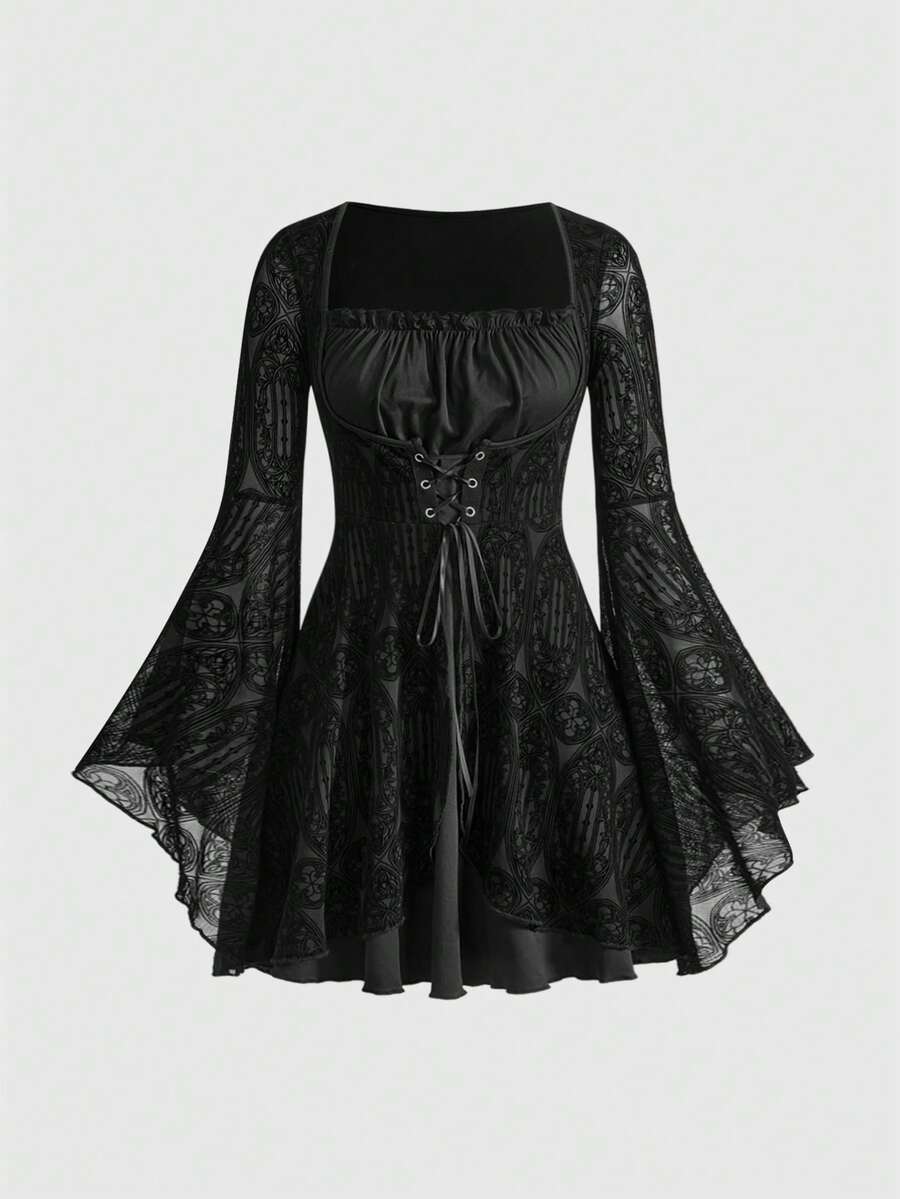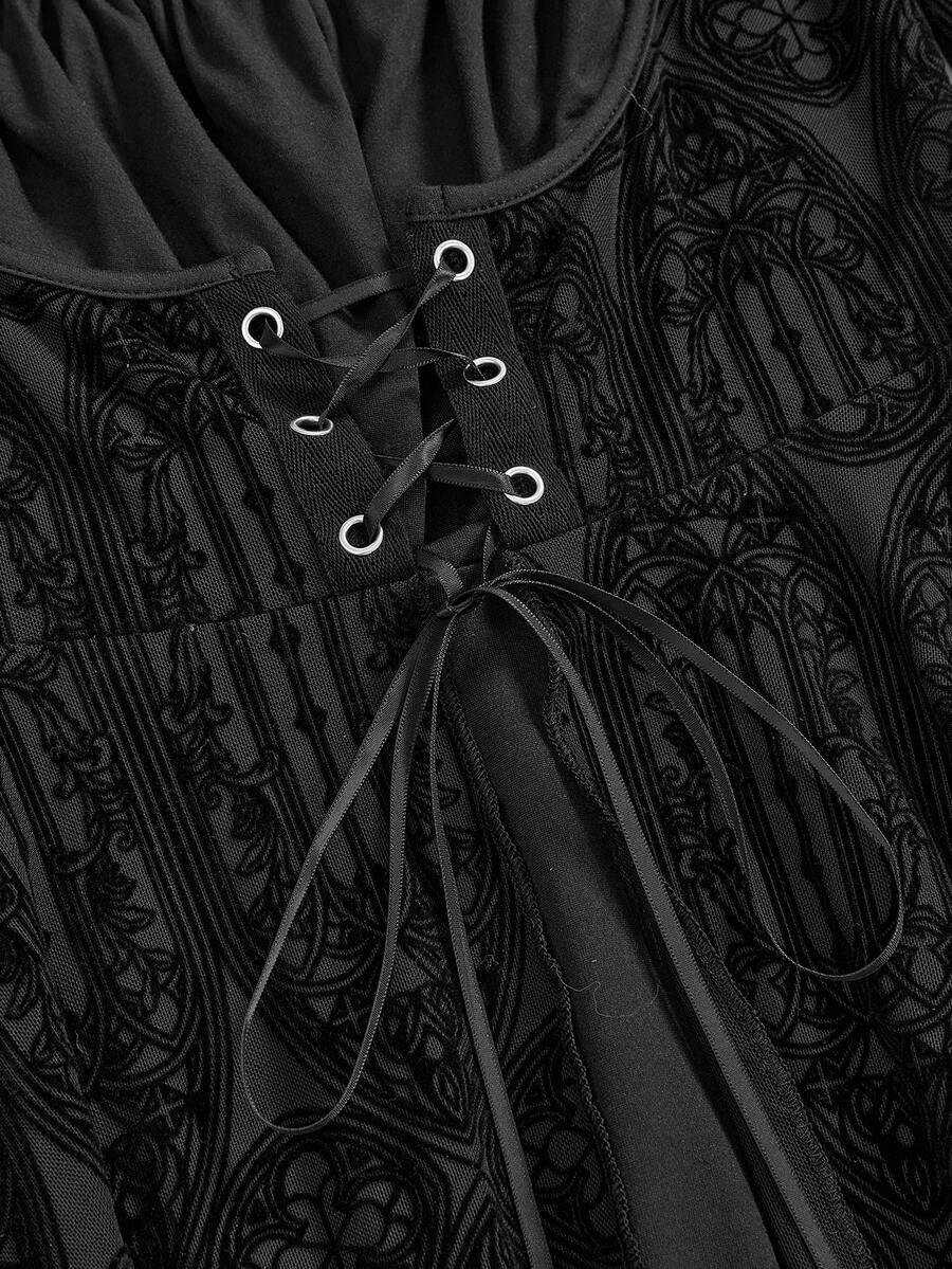 Goth Vestido de mujer con parche de encaje de malla con cruz floreada de estilo gótico y cordones en la cintura