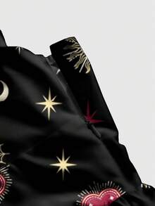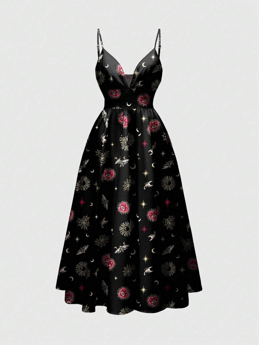 Goth Vestido sexy de mujer con tirantes finos, escote bajo y estampado romántico de bosque con cruz, corazón, gema, telaraña, escorpión, sol, luna y estrella en estilo gótico oscuro de arándano