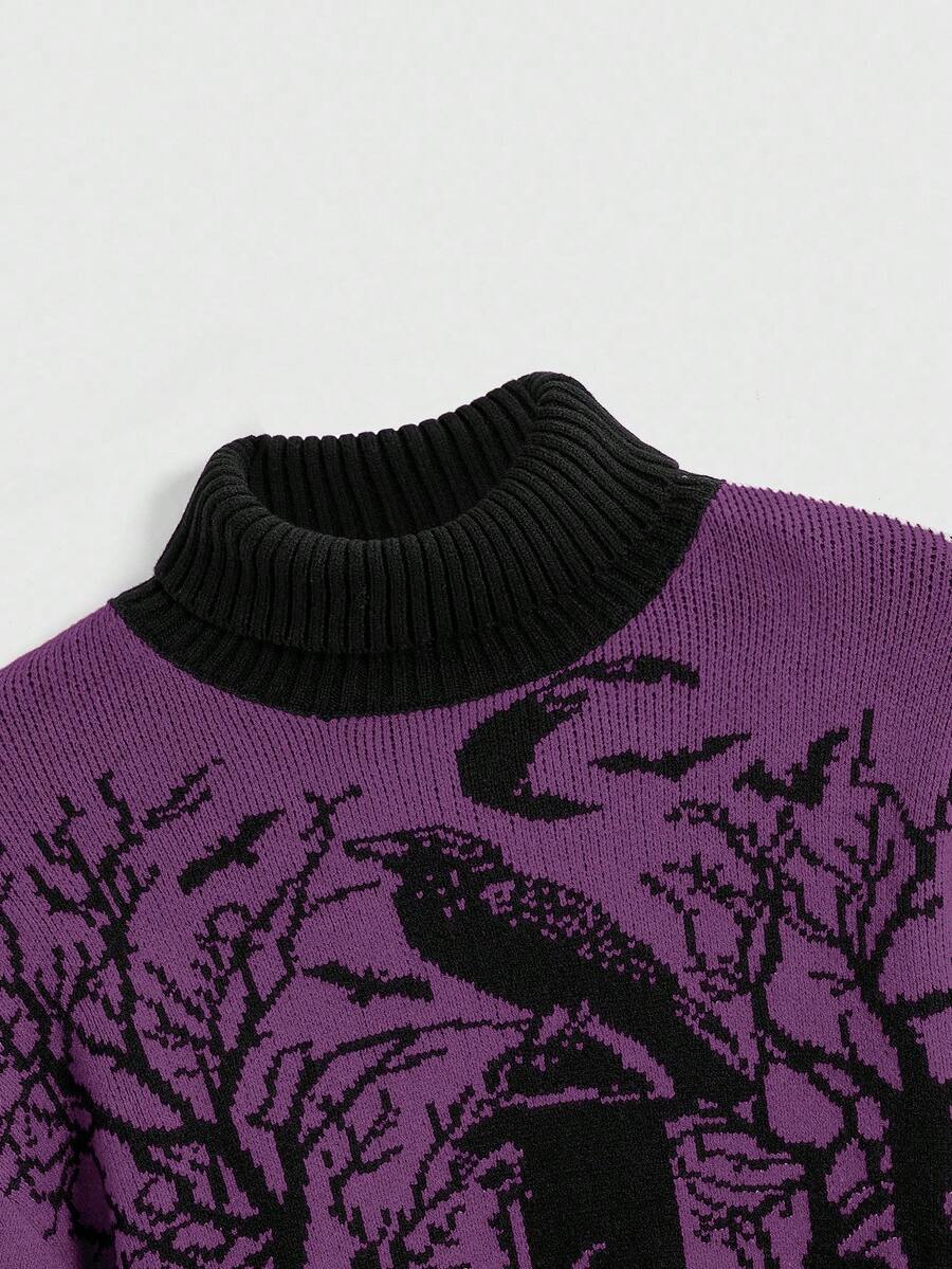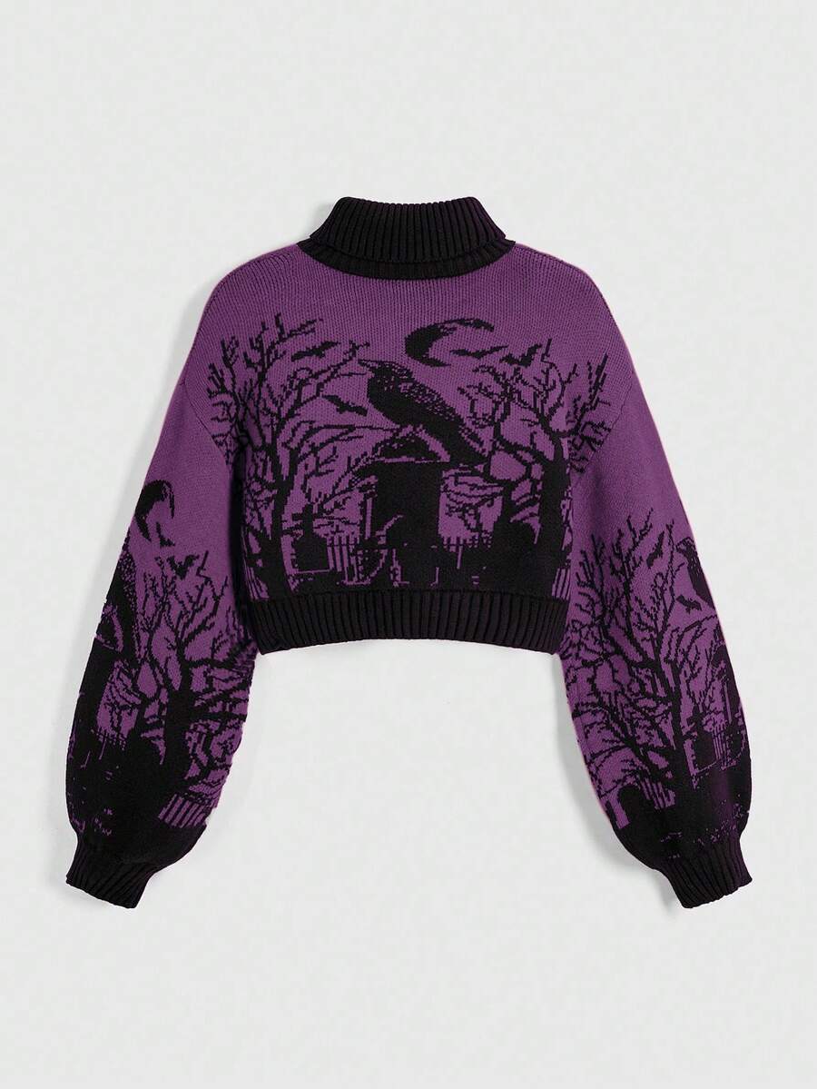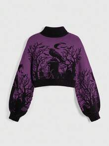 Goth Suéter de mujer de manga de linterna negra con estampado jacquard de luna, murciélago y rama de cementerio de cuervo de cuello alto y cálido de estilo gótico oscuro