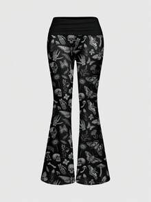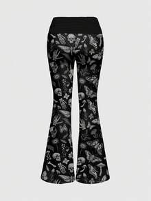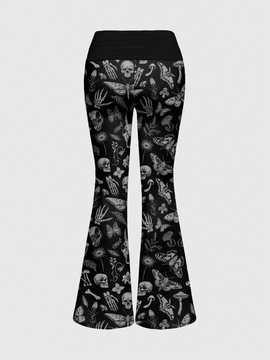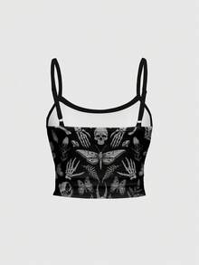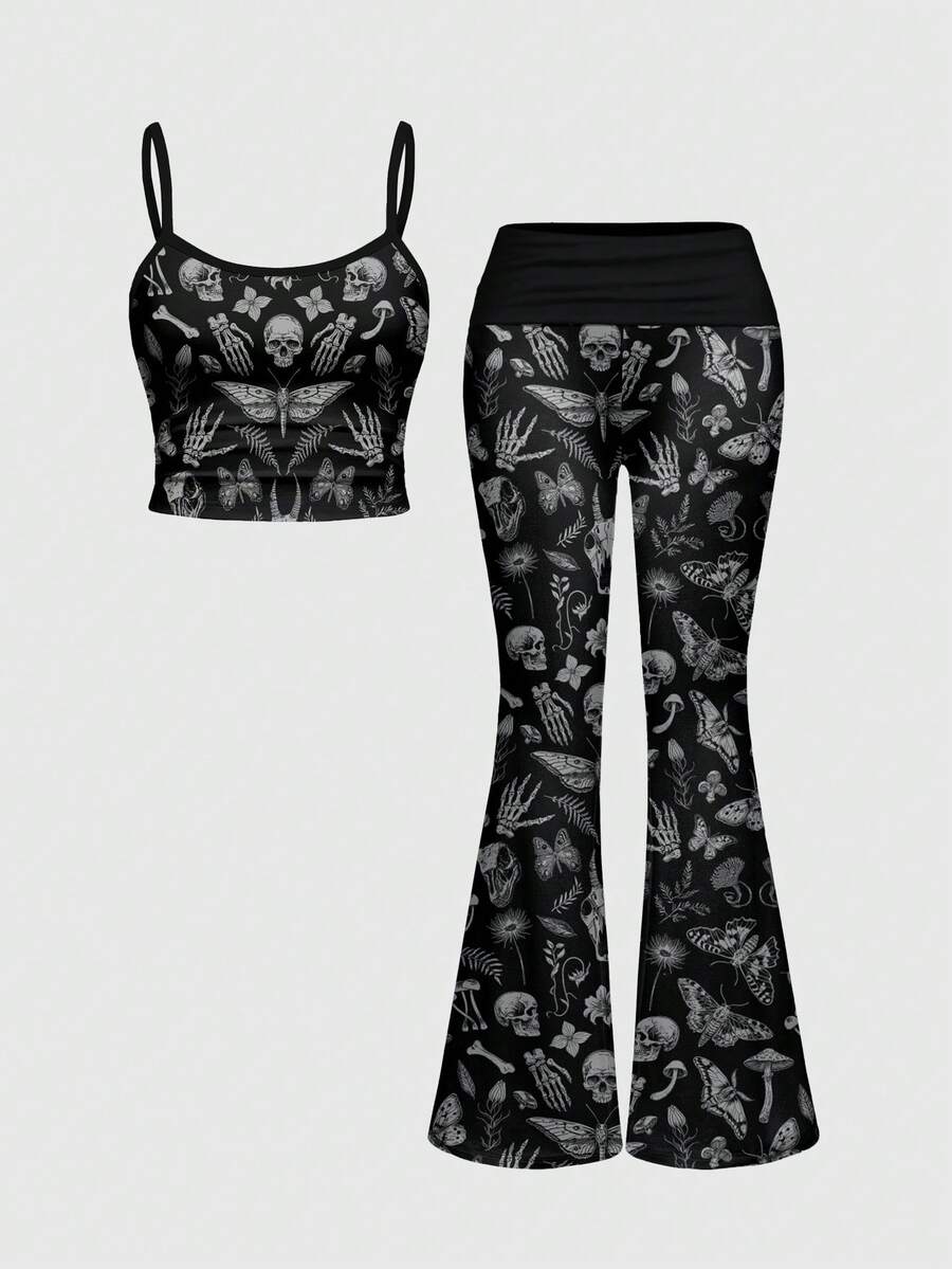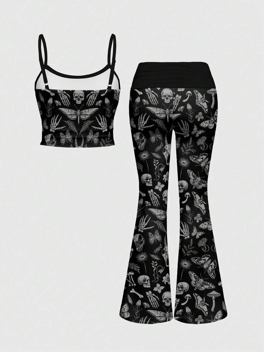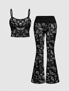 Goth Conjunto de 2 piezas de top de tirantes sexy y pantalones de cintura baja acampanados con diseño gótico de bosque oscuro, calavera, luna y estrellas para mujeres