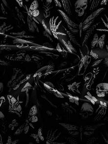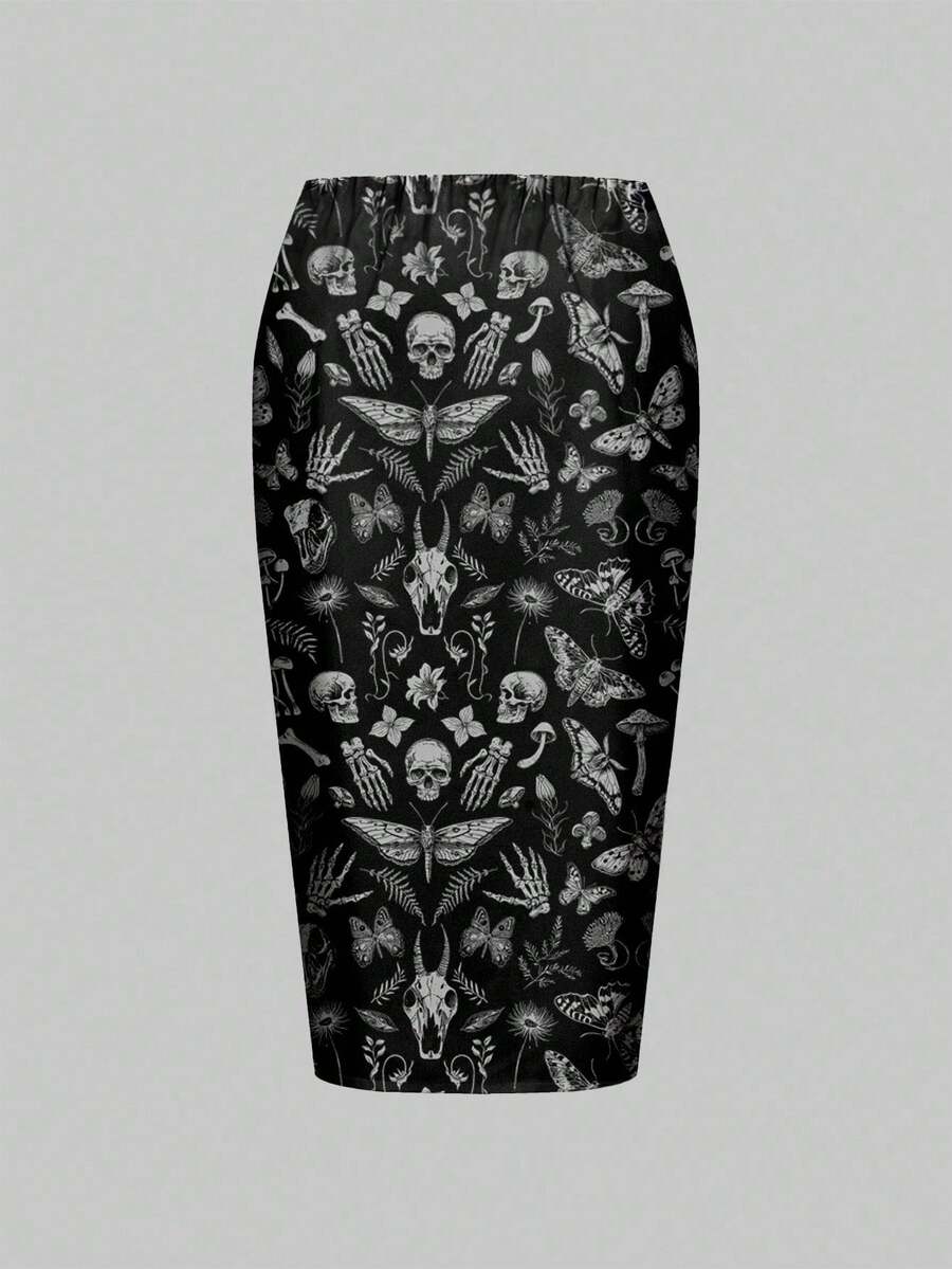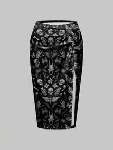Goth Falda larga con abertura alta y estampado todo sobre de calavera oscura, polilla y planta, estilo gótico, oscuro y misterioso, talla grande para Halloween