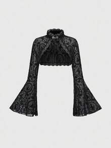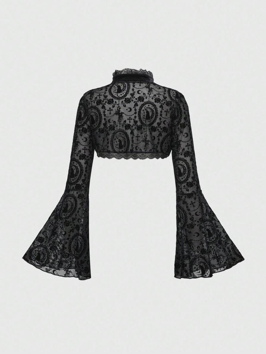 Goth Cárdigan vintage de mujer con mangas acampanadas, estampado de gato, luna y enredadera, con efecto flockado, de estilo gótico