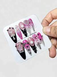 Anime 10 piezas de remaches con estilo Y2K, armadura francesa pintada a mano de colores, elemento de pegatina de lazo de rosa de alta calidad, pieza de uña postiza extraíble con forma de almendra súper larga, se puede reutilizar en todas las estaciones, adecuada para uso diario, salir a citas