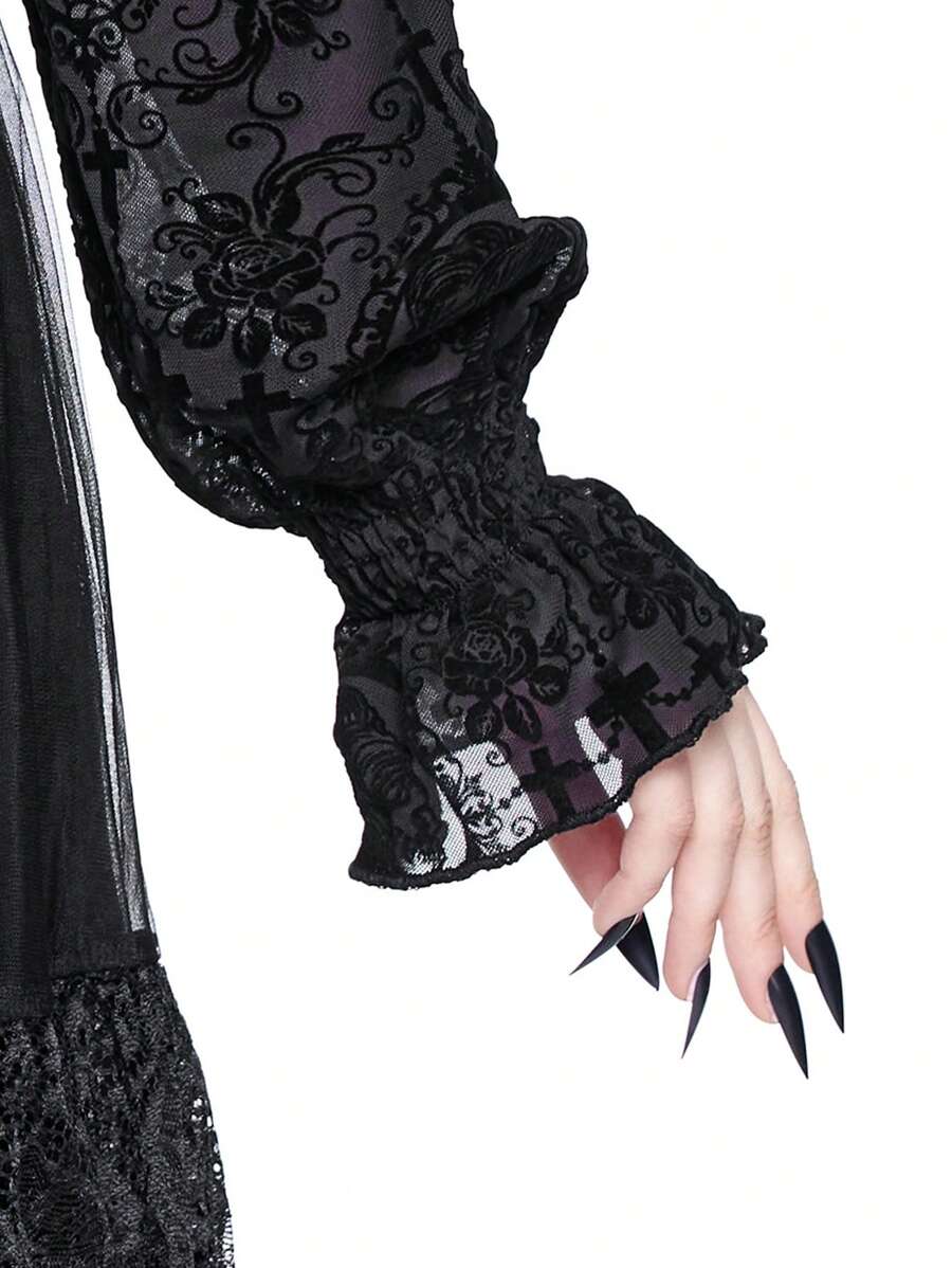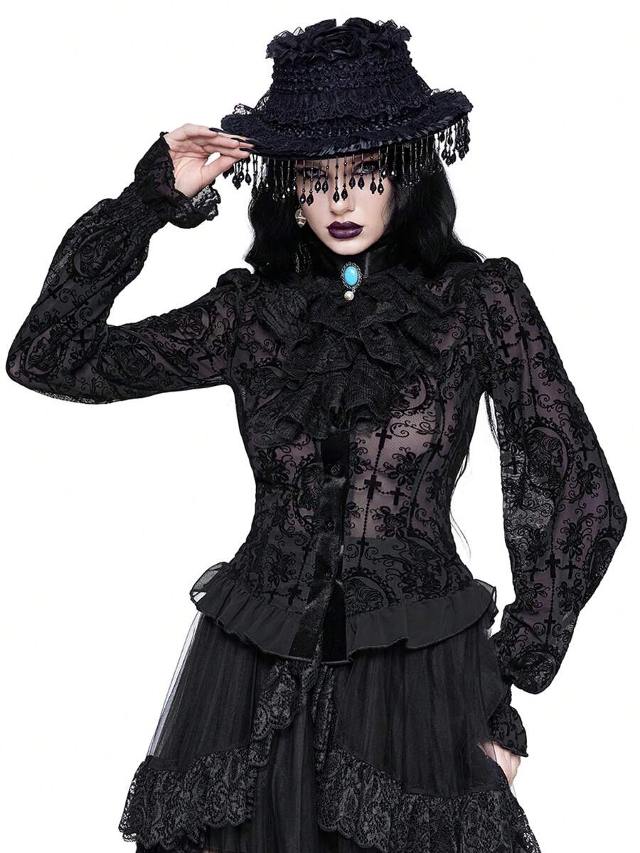Goth Camisa de mujer con patrón de calavera y cruz, cuello alto, mangas abullonadas y acabado con volantes en estilo gótico