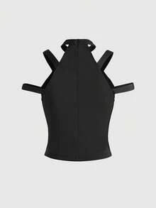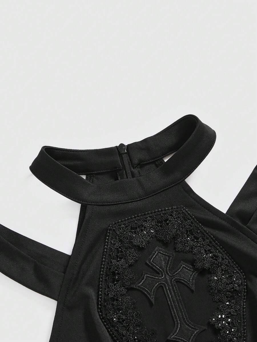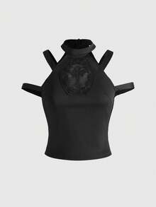 Goth Top sin hombros de mujer con parches de malla y luna hueca en estilo gótico