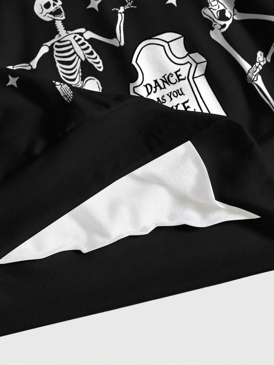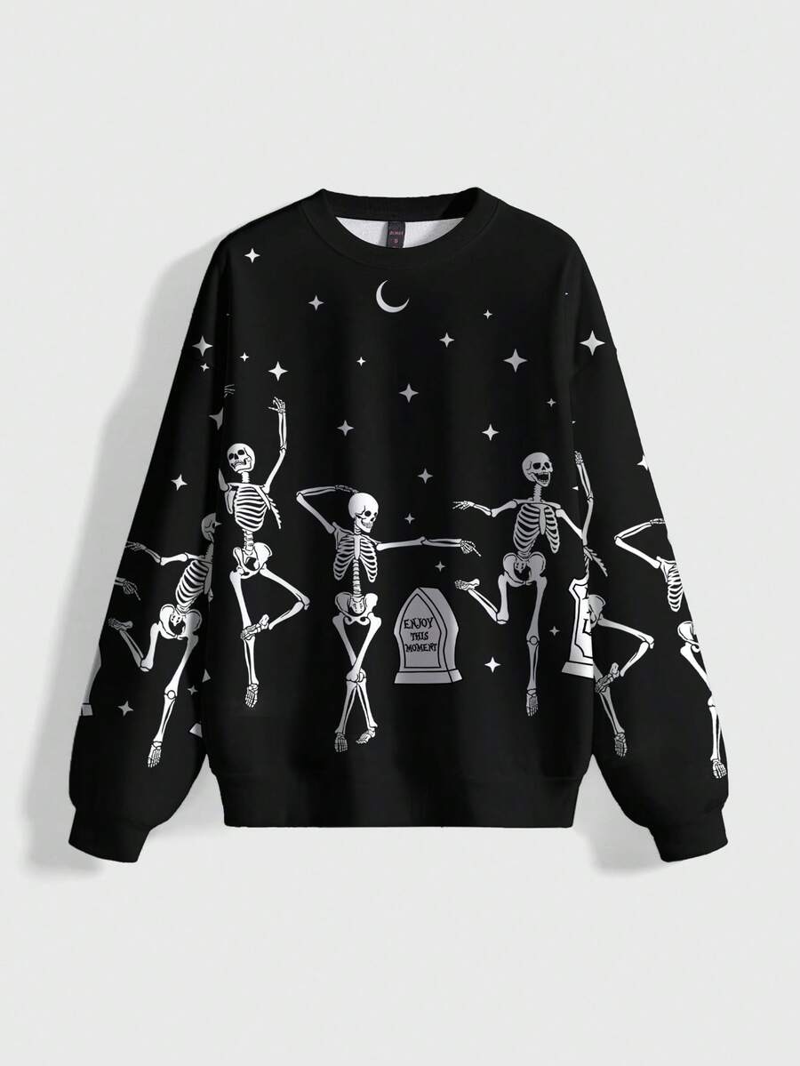 Goth Sudadera con cuello redondo de estampado completo con esqueleto bailando, luna y estrellas del cementerio gótico de terror para mujer, otoño/invierno/primavera
