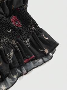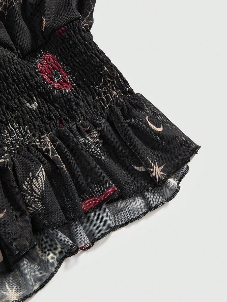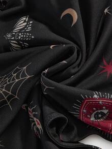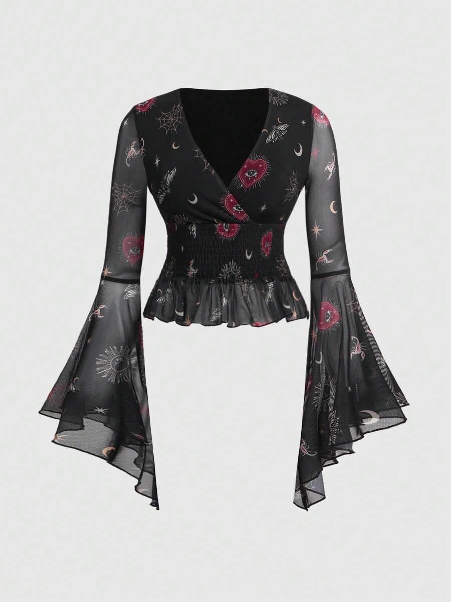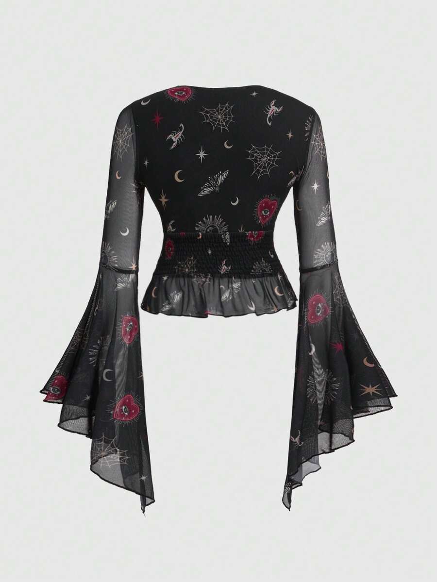 Goth Blusa con cuello en V, mangas acampanadas y estampado de corazón, ojo, serpiente, sol, luna y telaraña en estilo gótico y misterioso