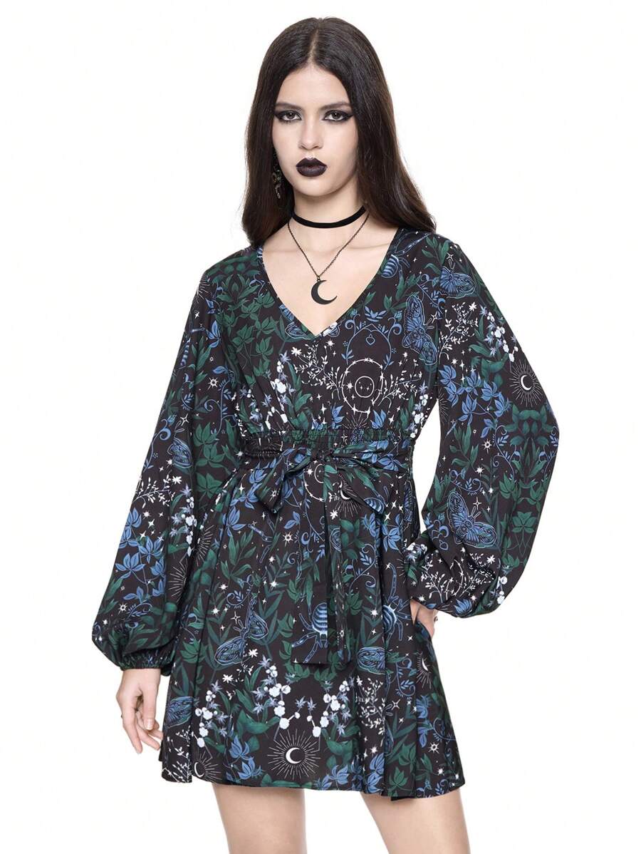 Goth Vestido corto con estampado de planta misterioso y gótico para mujeres