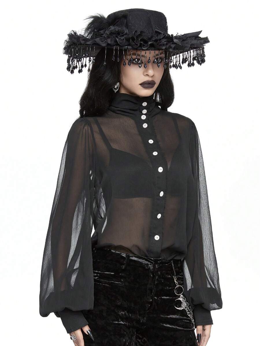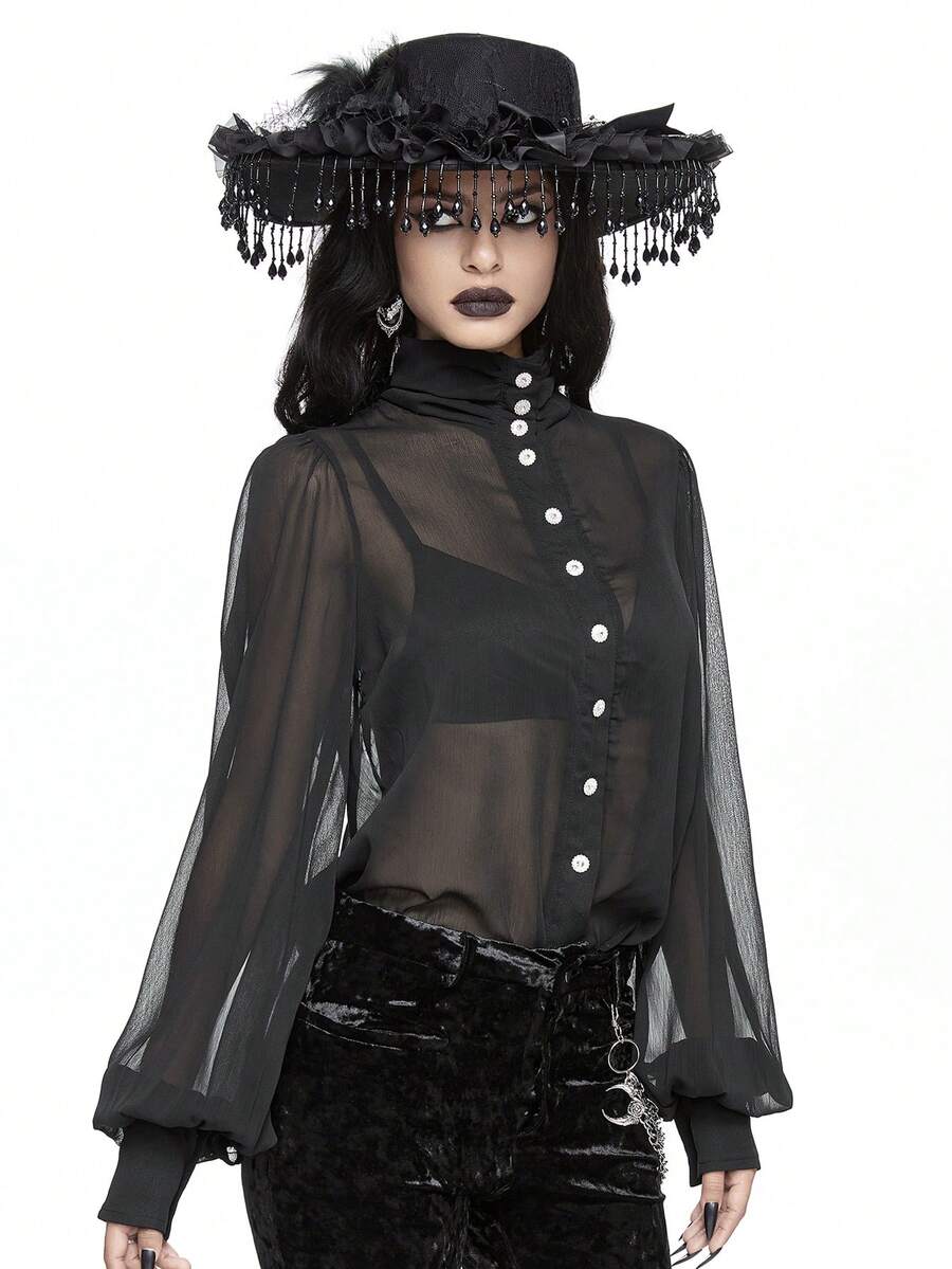 Goth Blusa de mujer de gasa con mangas farol de estilo palaciego gótico, semitransparente, incluye forro interior y top de bikini de satén