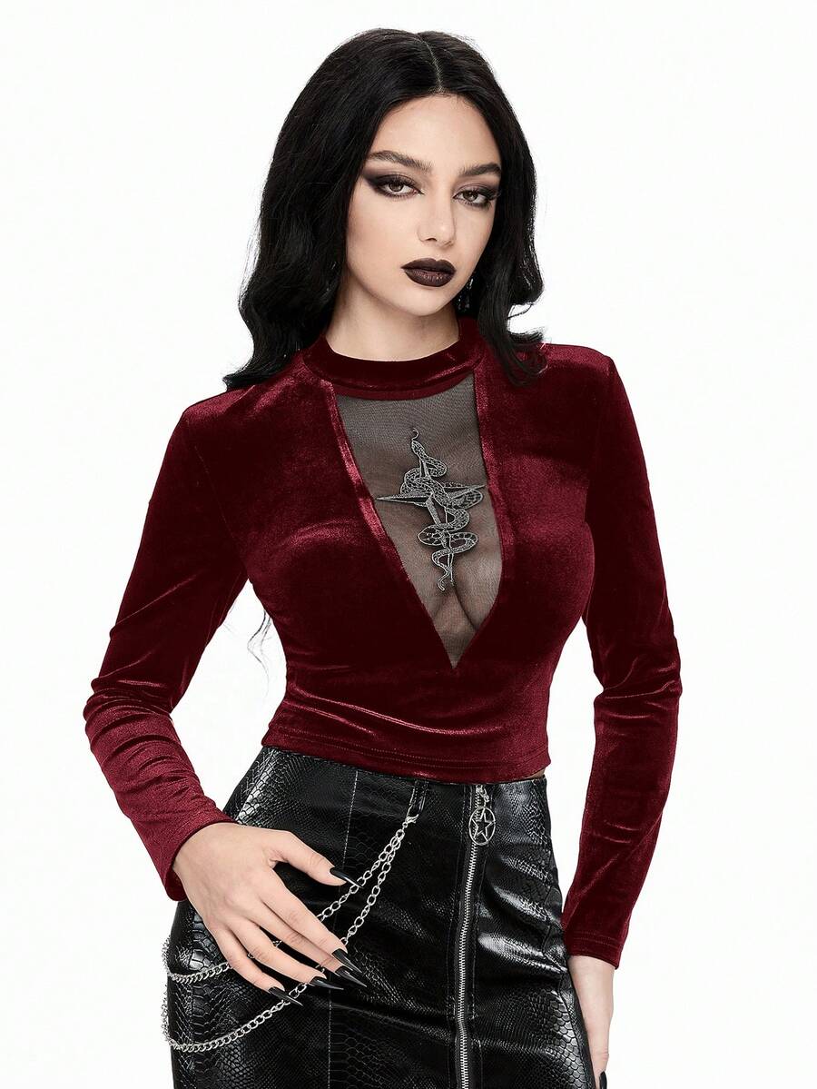 Goth Camiseta de terciopelo para mujer con estampado de serpiente bordado y diseño delantero hueco sexy gótico
