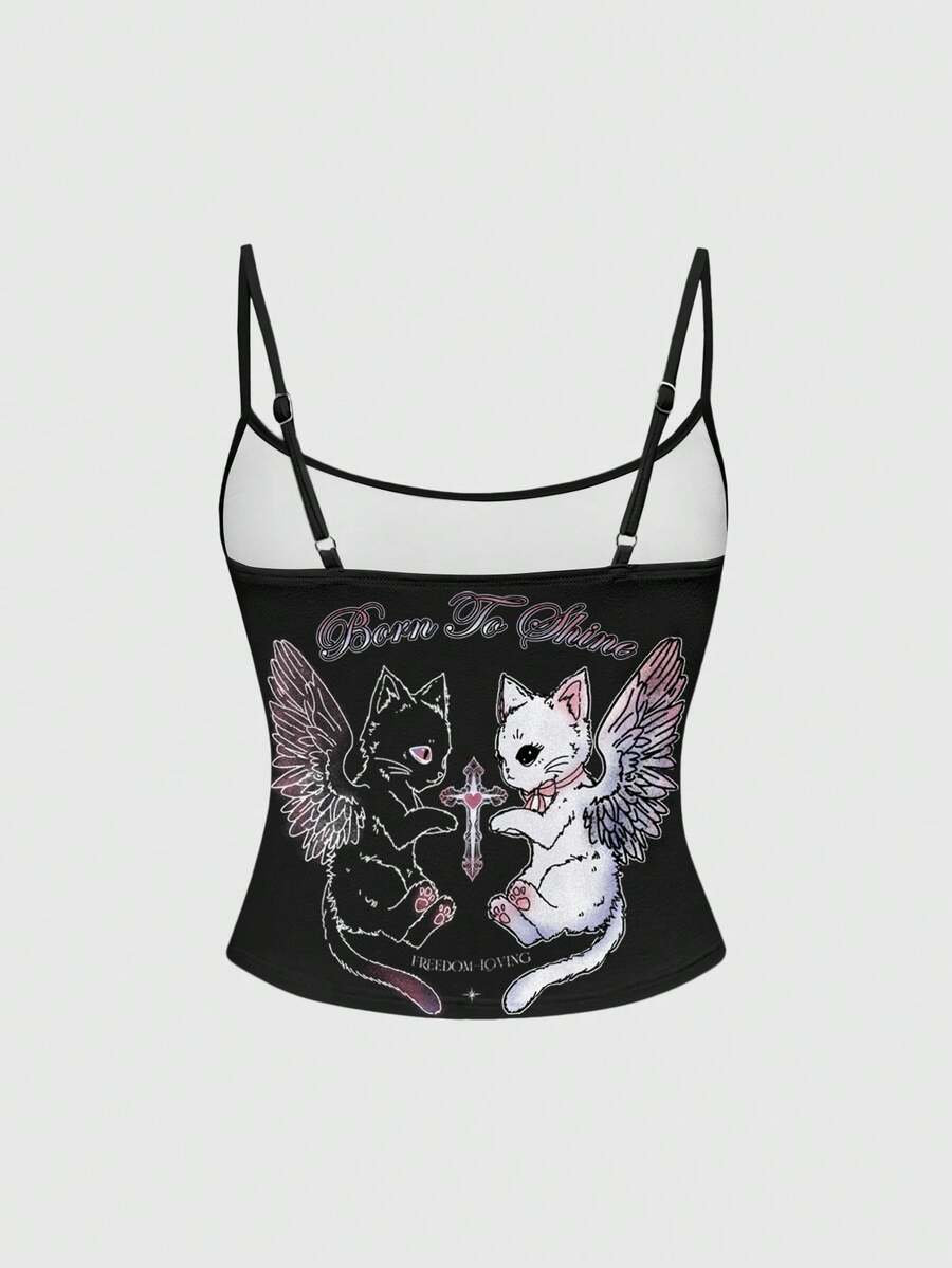 Goth Camiseta de tirantes de mujer con estampado de gato, cruz y corazón en estilo gótico