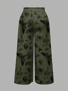 Goth Pantalones anchos y sueltos con estampado de planta verde, calavera, serpiente, polilla y araña, estilo gótico, talla grande, horror oscuro, Halloween