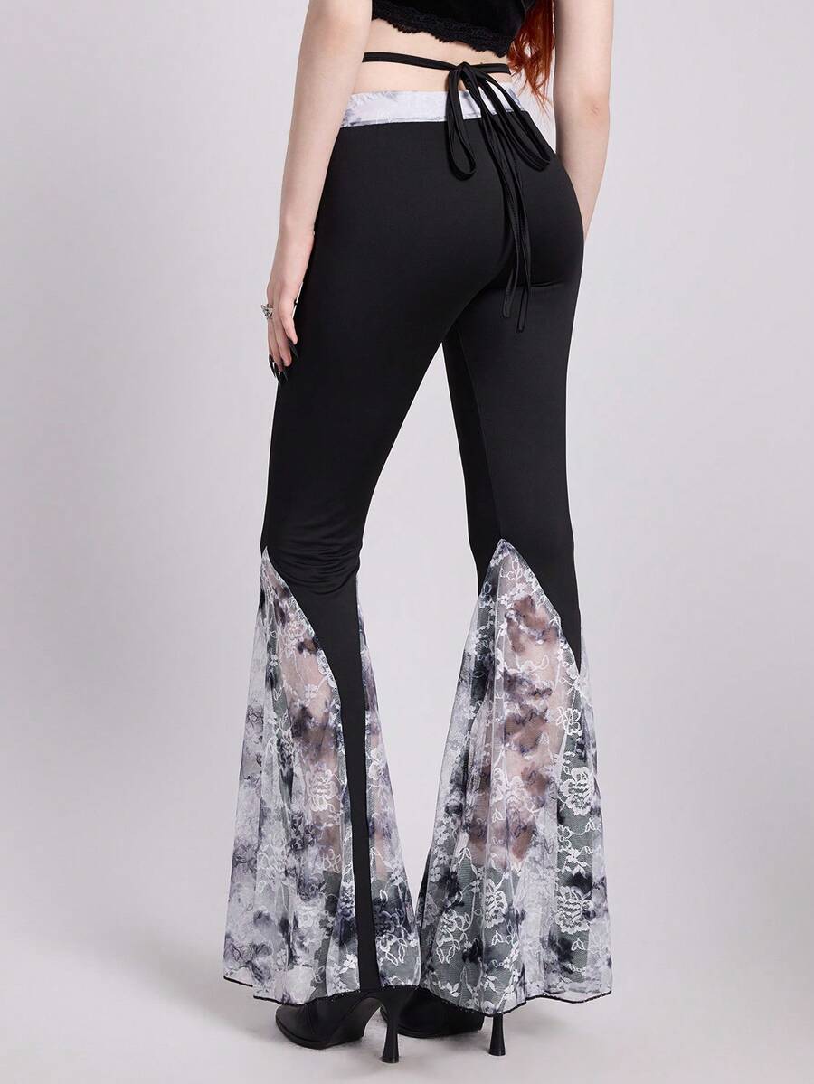 Goth Pantalones largos de campana con diseño de encaje y venda de estilo gótico de cintura baja para mujeres