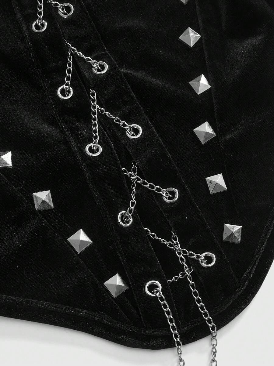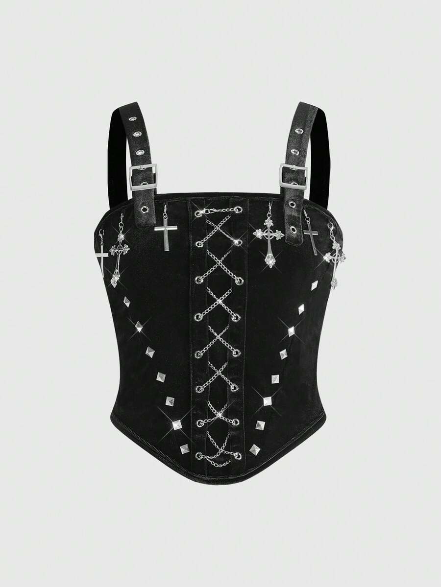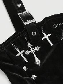 Goth Camiseta de terciopelo con marco de metal en forma de cruz y cadena de remaches, estilo gótico