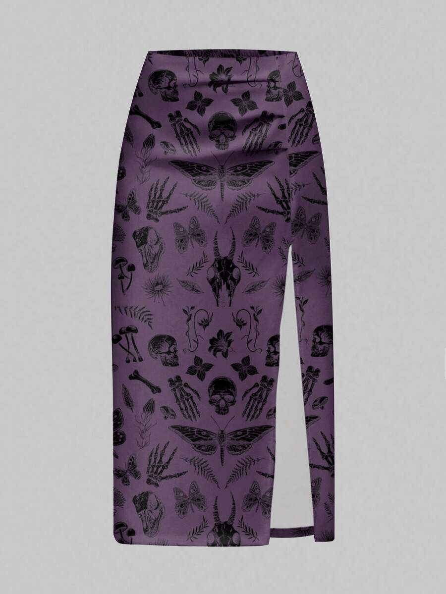 Goth Falda con abertura alta con estampado floral de esqueleto, planta, polilla y libélula en estilo gótico, misterioso y oscuro para mujeres