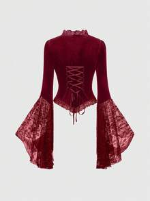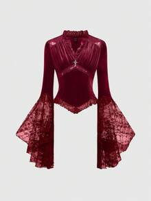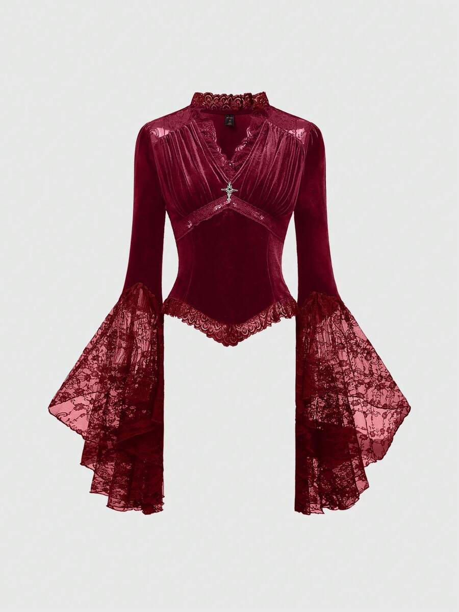 Goth Blusa de mujer con cuello en V, mangas acampanadas, encaje y volantes en la cintura, estilo gótico y vintage