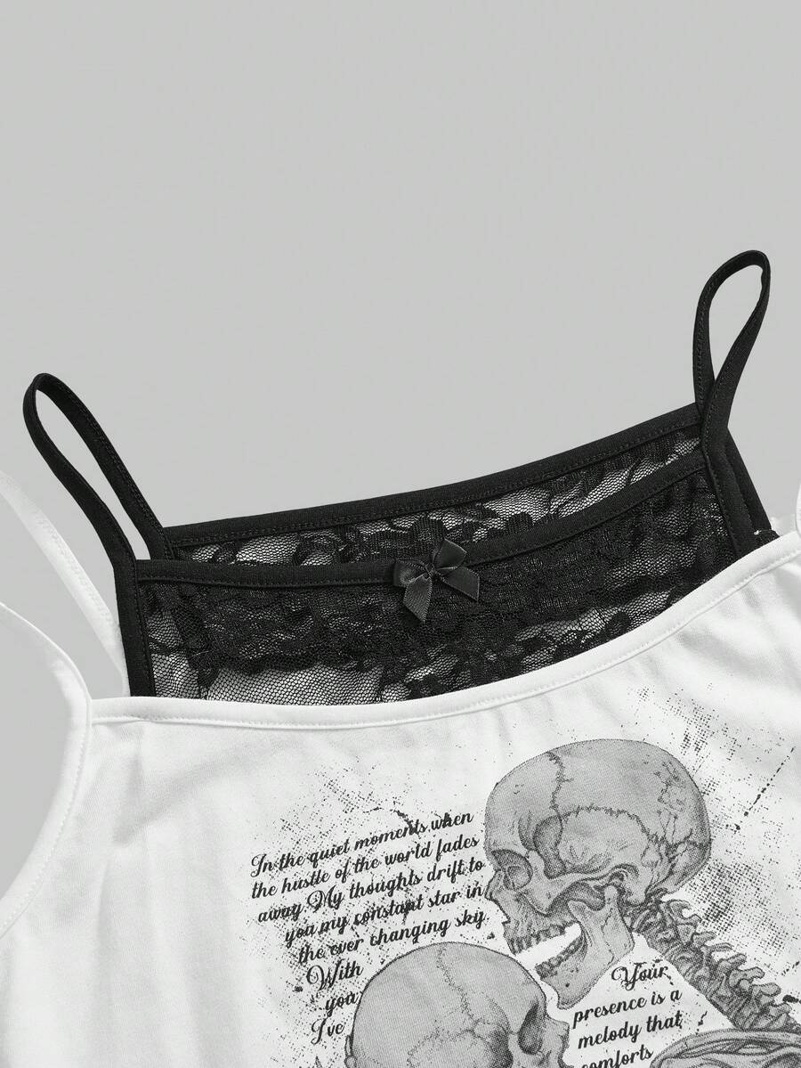 Parte superior sin mangas con estampado de abrazo de calavera, encaje y patchwork, con estiramiento, en estilo gótico, vintage y Y2K para mujeres