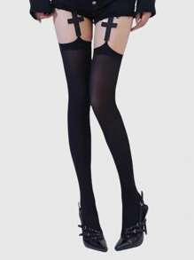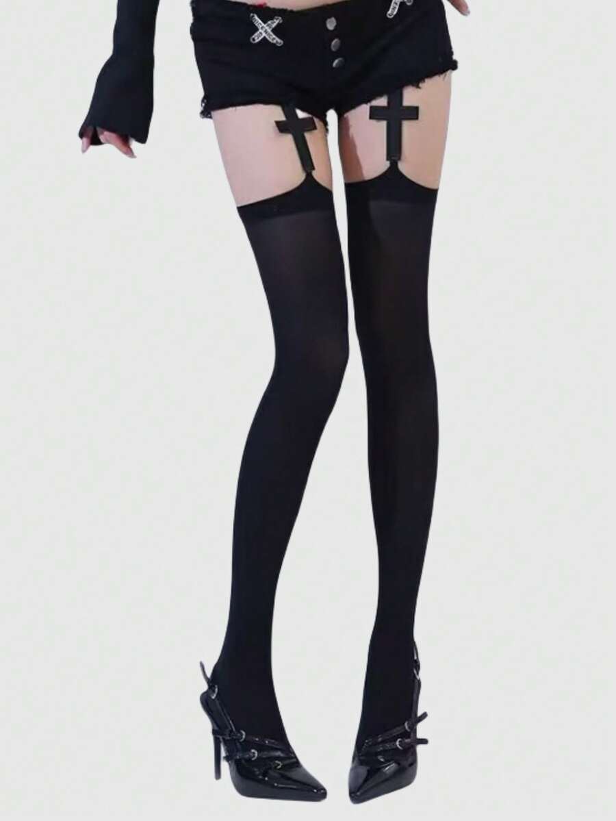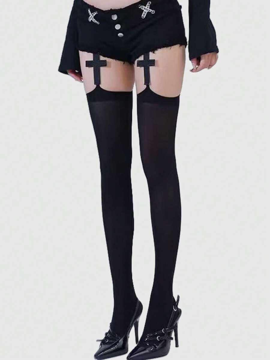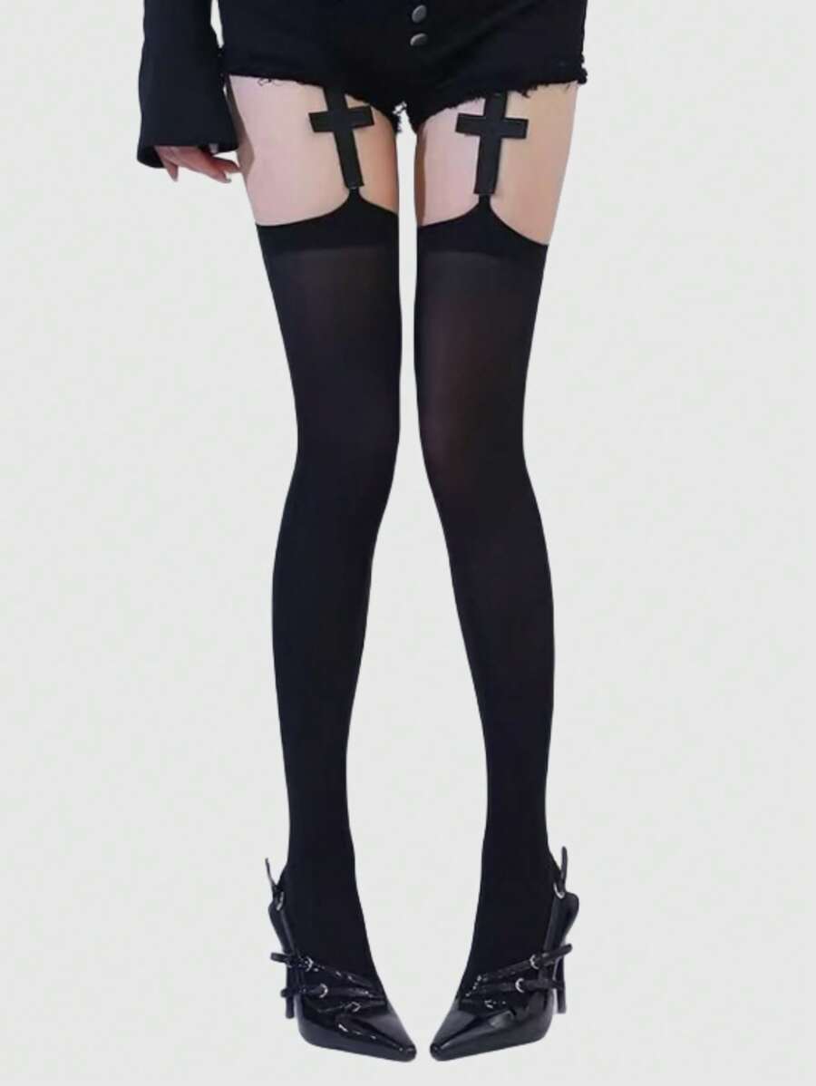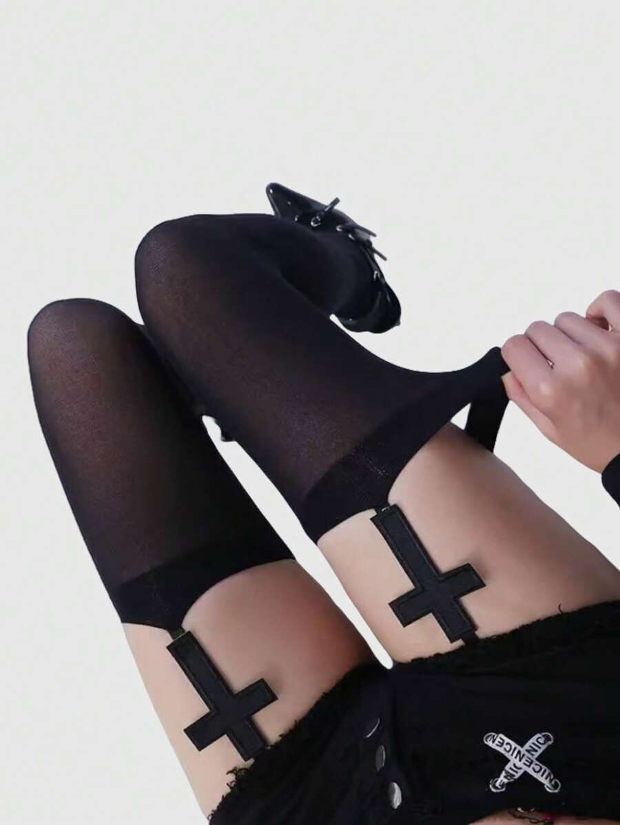 Grunge Punk 1 par de calcetines de tirantes con patrón de cruz negro oscuro de estilo gótico, para Halloween