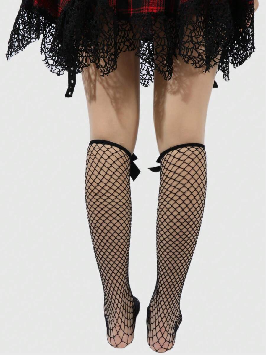Grunge Punk 1 par de medias altas hasta la rodilla de mujer de color oscuro con lazo y malla, para todas las estaciones